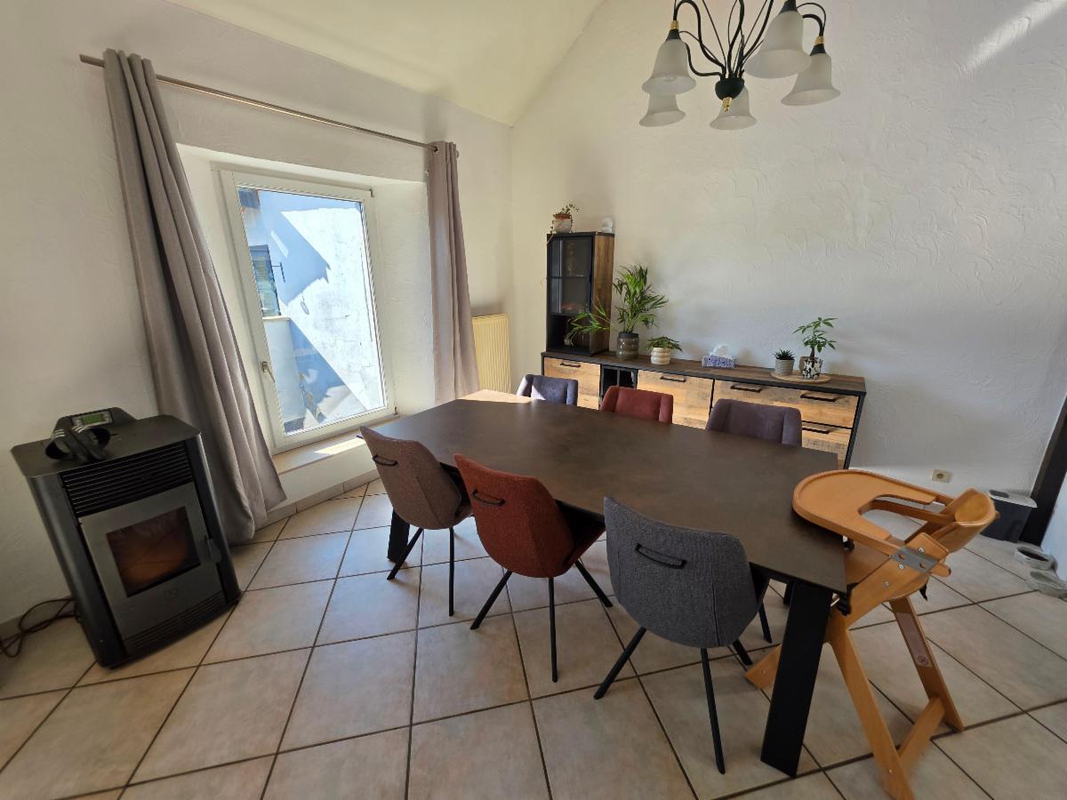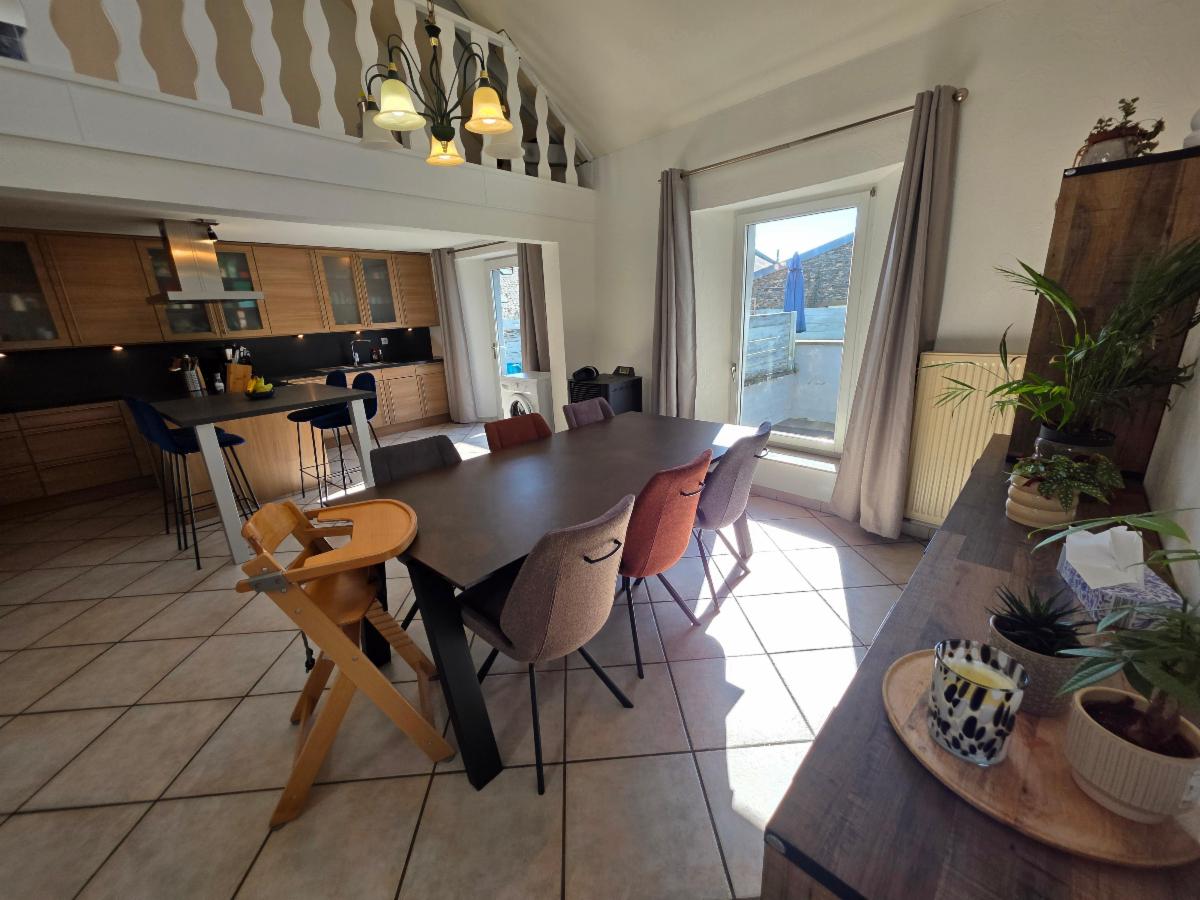 La maison comporte actuellement 2 entrées distinctes. L'entrée vers la l'habitation principale se compose d'un couloir avec WC, d'un pallier menant aux pièces de vie situées au 1er étage, savoir un grand salon avec poêle à bois suivi d'une grande pièce ouverte surplombée par des poutres en bois apparentes, comprenant cuisine et salle à manger, avec poêle à pellets. L'accès vers la terrasse se fait depuis la cuisine. Au 2ème étage se trouvent 2 chambres et une salle de bain, ainsi que l'accès au 3ème étage étant une mezzanine actuellement aménagée en chambre. Le bien se compose également d'un grand garage en longueur, accessible depuis la route voisine à celle de l'entrée et pouvant mener à l'habitation par la terrasse. La 2ème entrée mène à une grande pièce de vie, suivi d'une salle de bain et cuisine, pour terminer par une chambre donnant l'accès à une terrasse.
