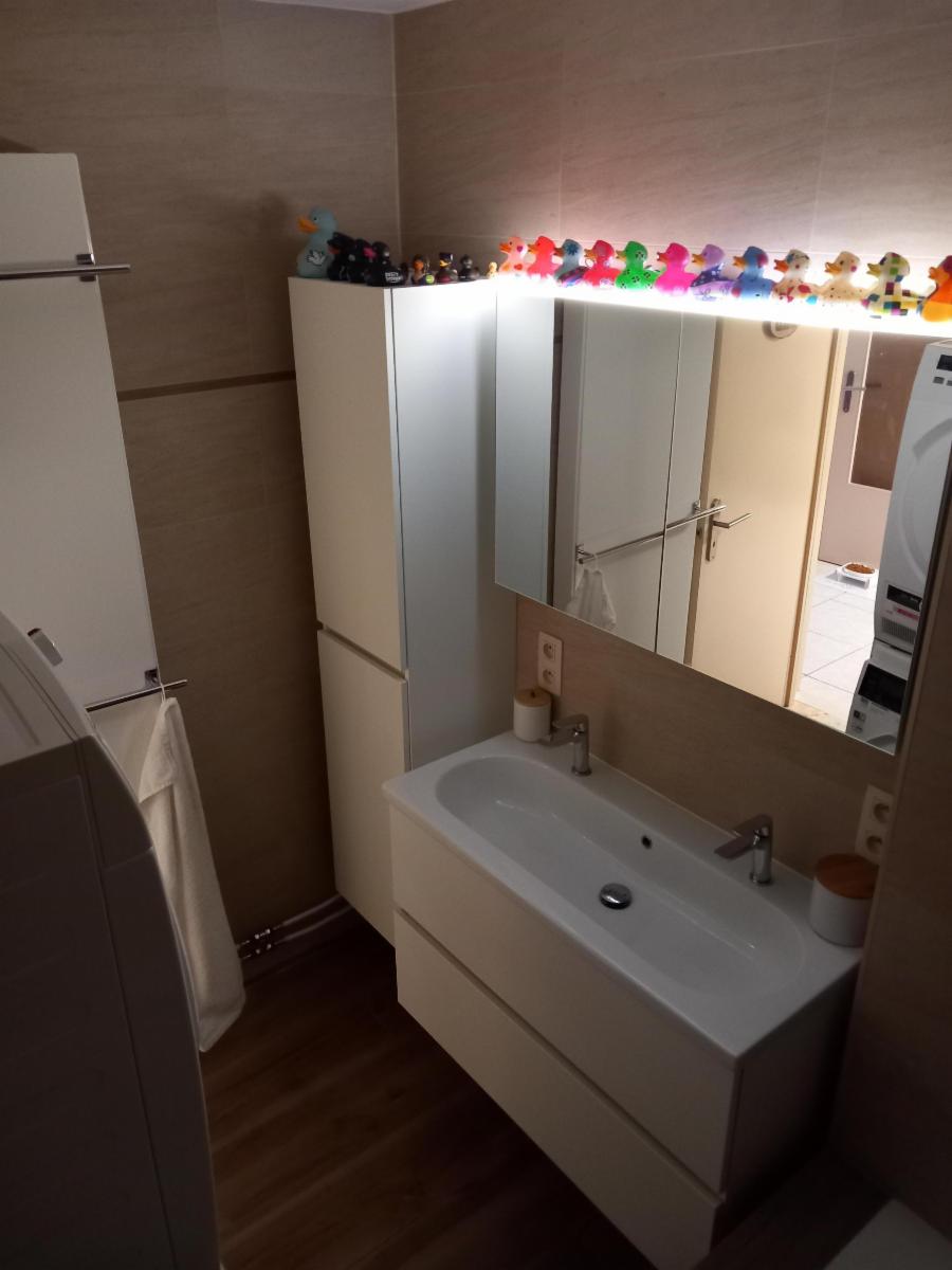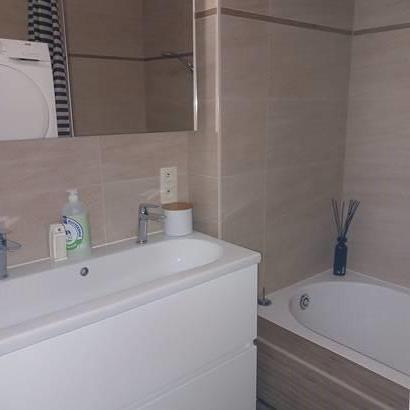 Salle de bain équipée rénovée en 2016 avec baignoire/douche, double lavabo, espace de rangement suffisant et raccordement pour lave-linge et sèche-linge à condensation.