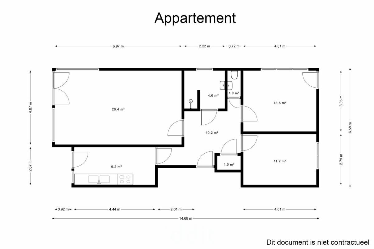 Appartement à Strombeek-Bever, près de Bruxelles, au troisième étage, comprenant un salon et une cuisine avec terrasse à l'avant, un hall, une salle de bains, des toilettes, un dressing et deux chambres à l'arrière avec terrasse et placard mural, une cave et un garage. G score: A P score: A