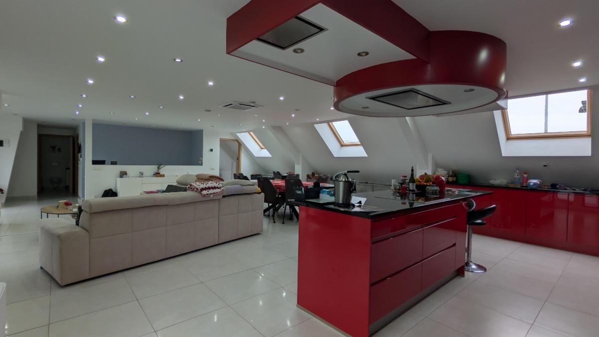 A l’étage, une grande pièce de vie avec cuisine équipée (frigo encastrable + frigo américain, lave-vaisselle, four, taque induction, hotte à charbon), une chambre parentale avec dressing, une deuxième chambre, un WC séparé, une salle-de-bain.