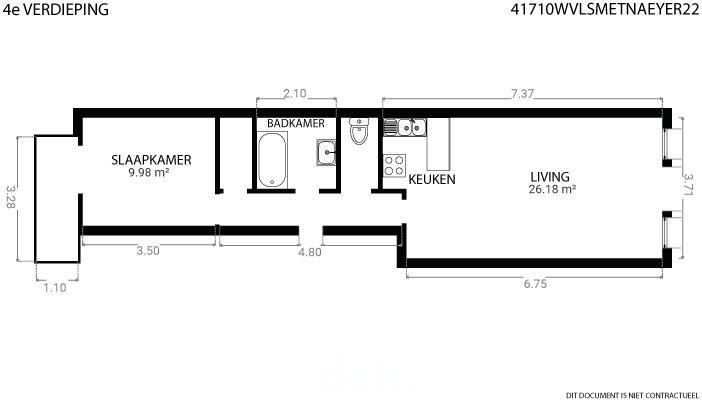 Cet appartement se compose d’un séjour avec cuisine, d’une chambre donnant accès à une terrasse à l’arrière, d’une salle de bains et de toilettes séparées.