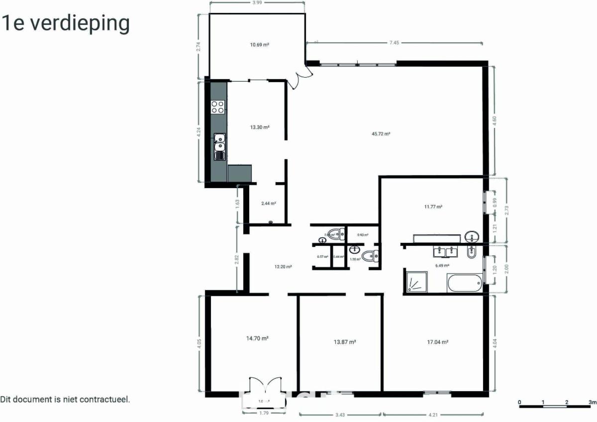 L'appartement comprend un hall d'entrée, une cuisine, un salon-salle à manger, une salle de bain, 2 toilettes, 4 chambres, un débarras, une terrasse rénovée et une cave au sous-sol. Le logement est chauffé électriquement. La garage est située également au sous-sol, avec possible un espace pour 2 voitures (environ 39 m²). Un ascenseur est présent dans l'immeuble. G score: A P score: A