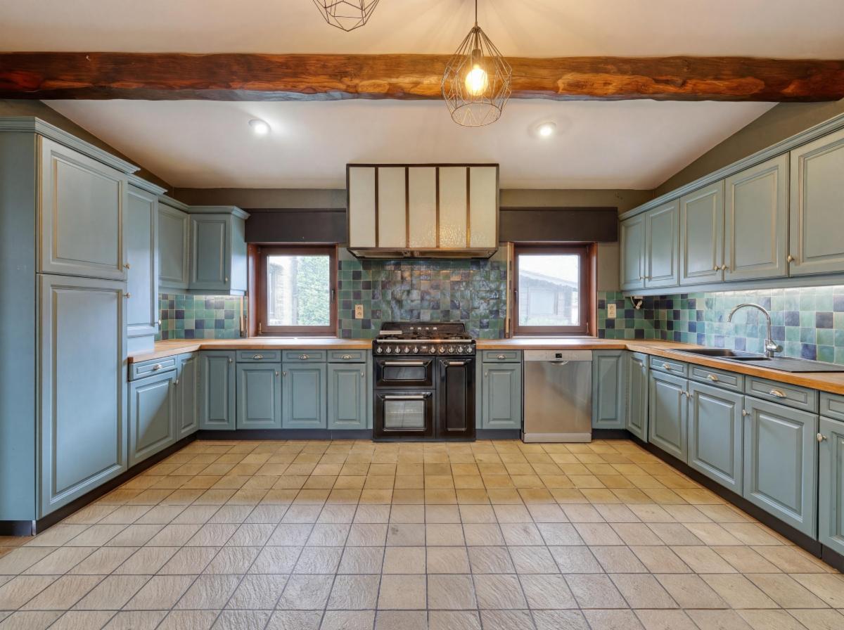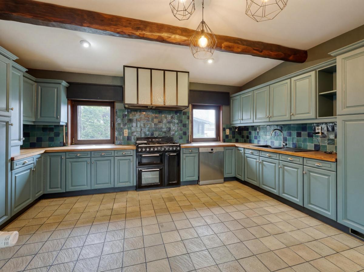 - Au rez-de-chaussée : un hall , une pièce vestiaire/buanderie avec WC, un grand séjour avec cheminée équipée d’une cassette, un petit hall avec ascenseur, une grande cuisine dinatoire et équipée (cuisinière professionnelle, hotte, four, lave-vaisselle), une véranda, un garage avec porte électrique, et une arrière cuisine/buanderie donnant accès à l’arrière du jardin ;