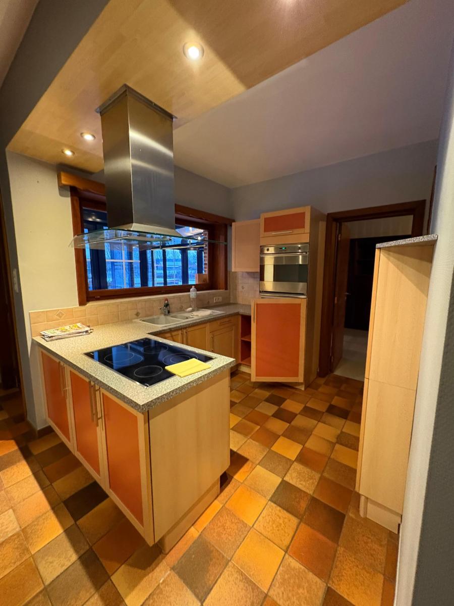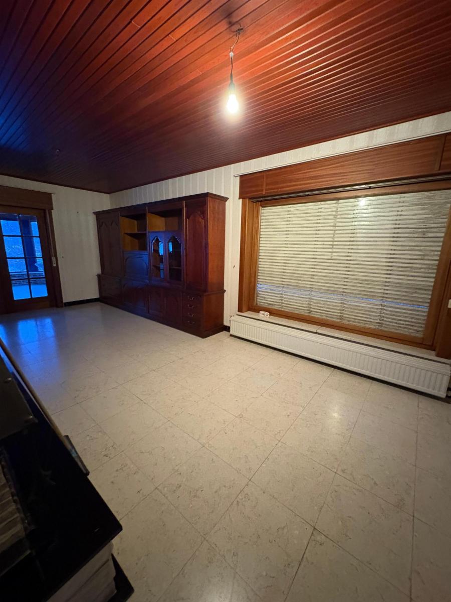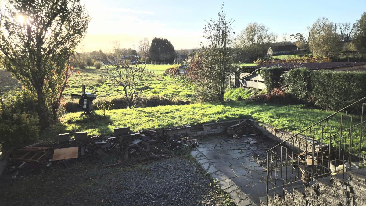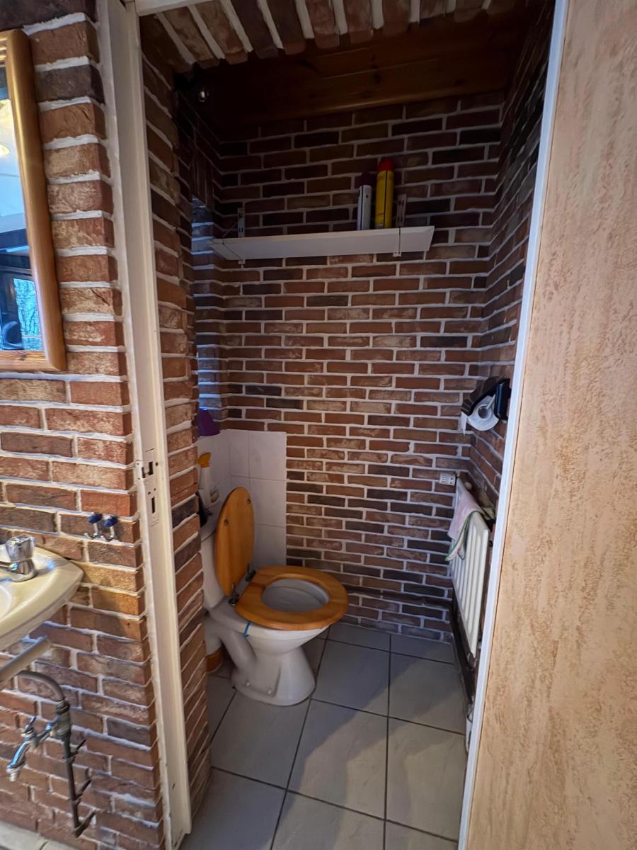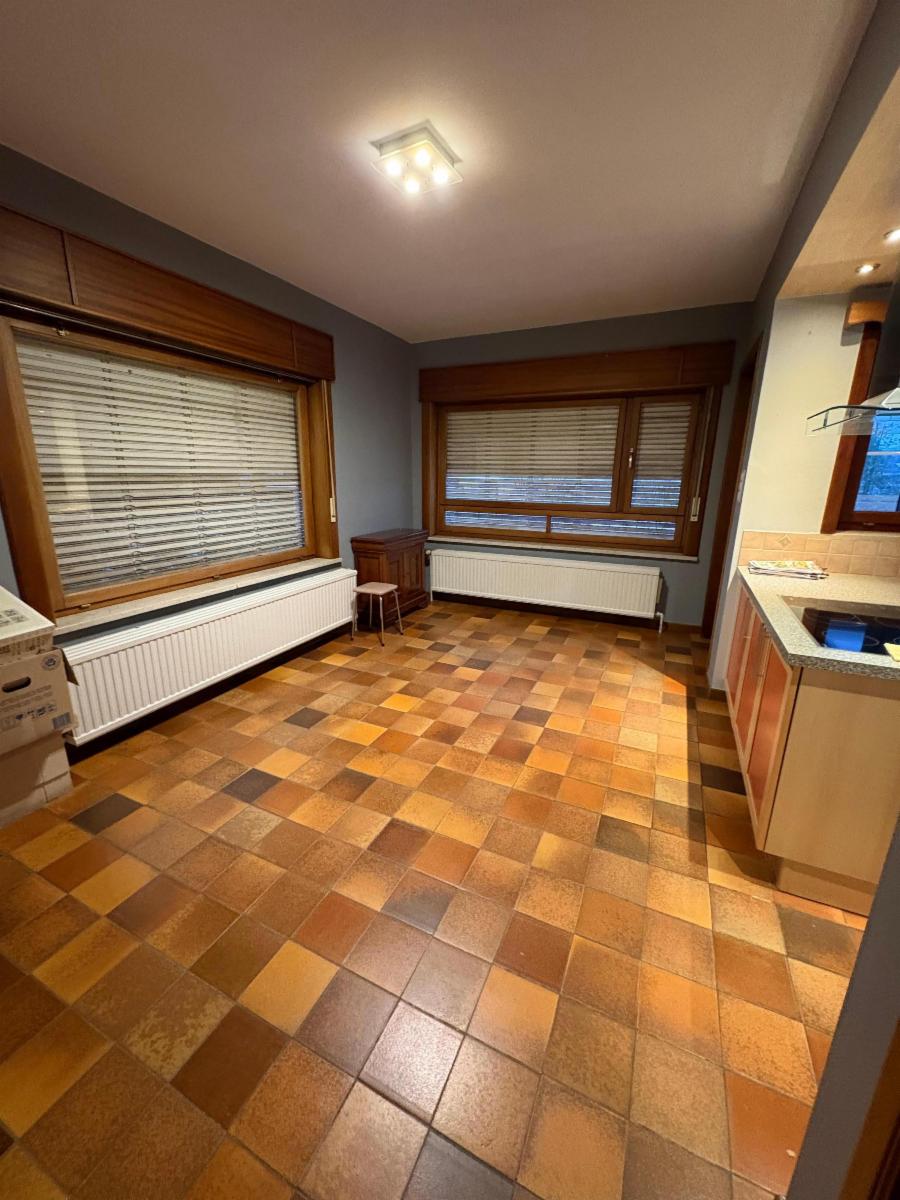 Vaste hall d’entrée desservant un bureau ou chambre, une salle de bains (baignoire, lavabo), un WC séparé, une agréable salle à manger avec feu au bois, une cuisine ouverte équipée (réfrigérateur, taques vitrocéramiques, hotte, four, double évier), un salon, ainsi qu’une véranda offrant une belle vue sur le jardin.