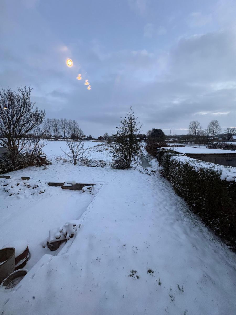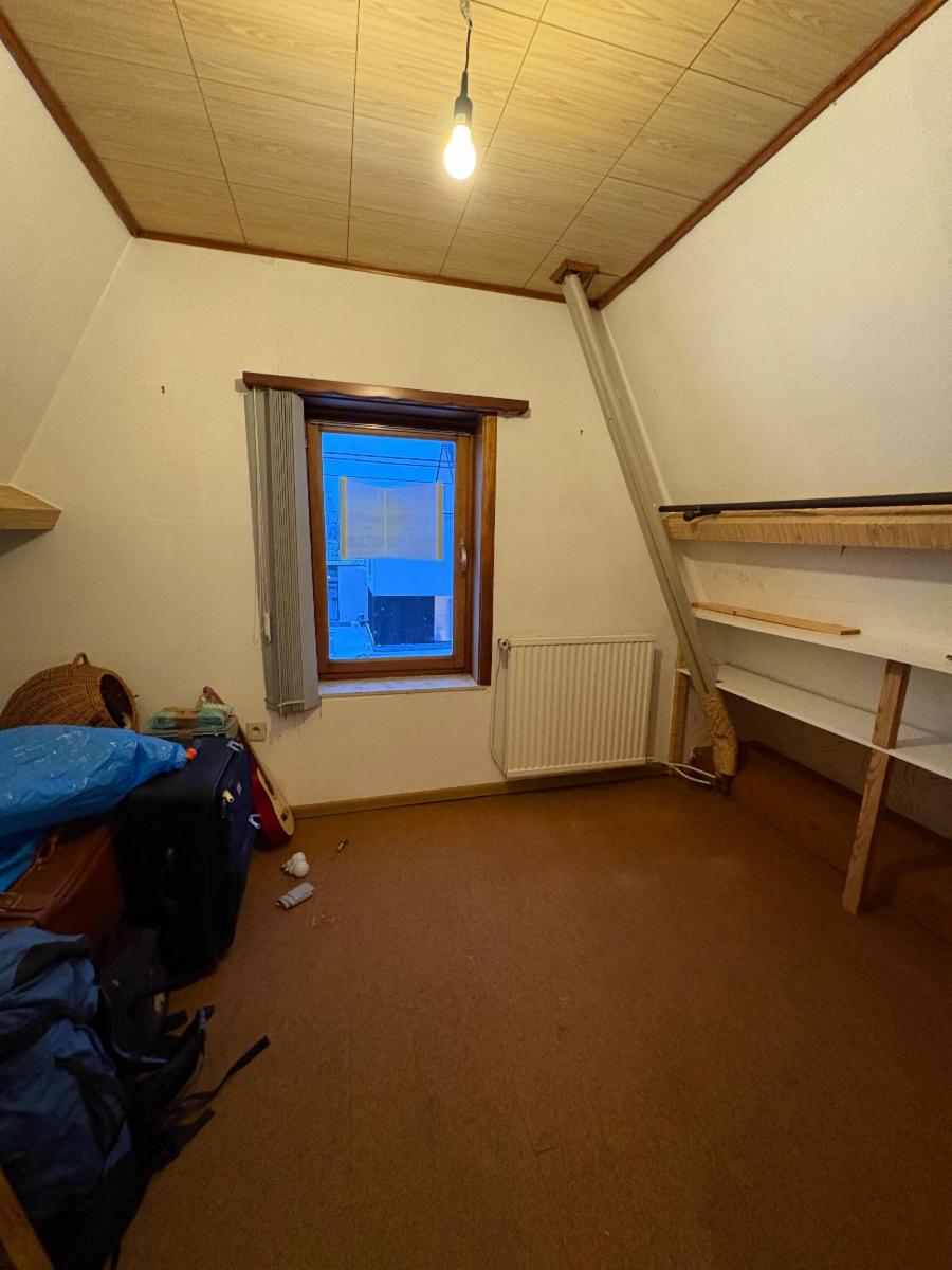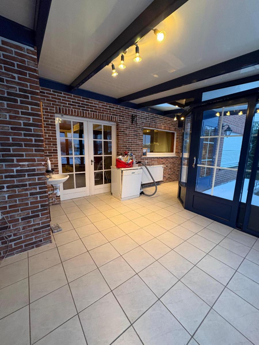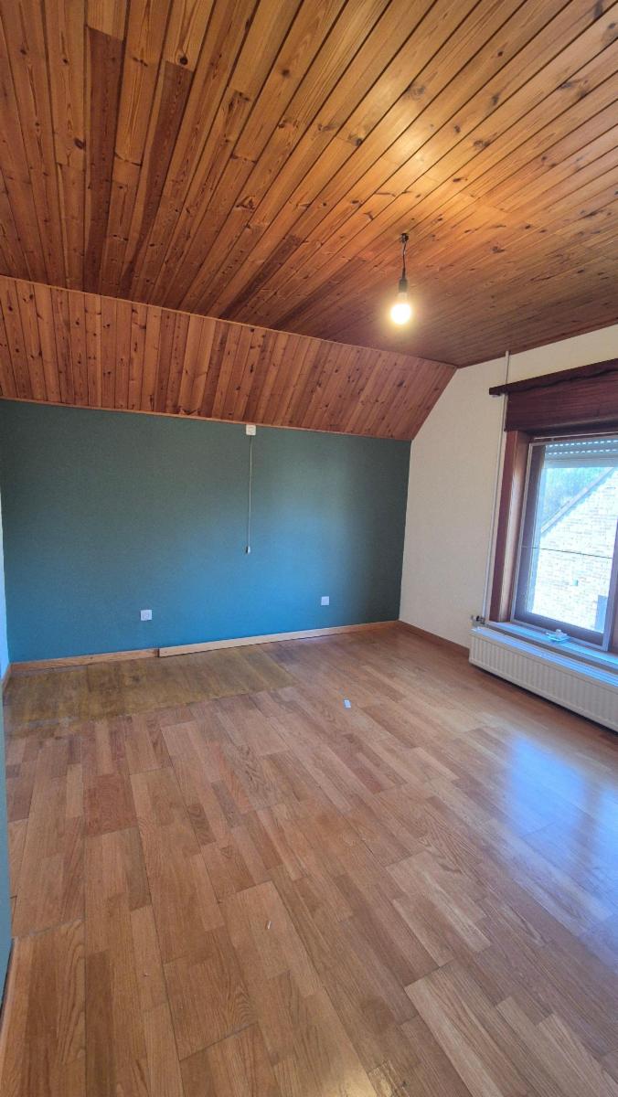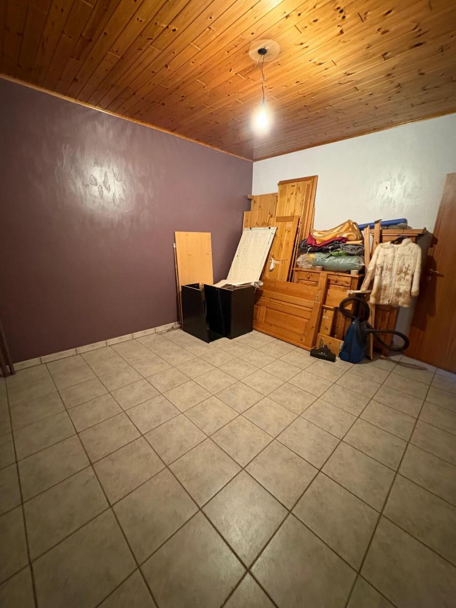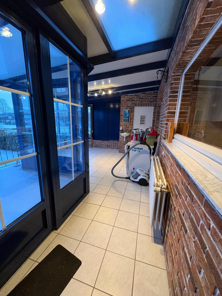 Vaste hall d’entrée desservant un bureau ou chambre, une salle de bains (baignoire, lavabo), un WC séparé, une agréable salle à manger avec feu au bois, une cuisine ouverte équipée (réfrigérateur, taques vitrocéramiques, hotte, four, double évier), un salon, ainsi qu’une véranda offrant une belle vue sur le jardin.