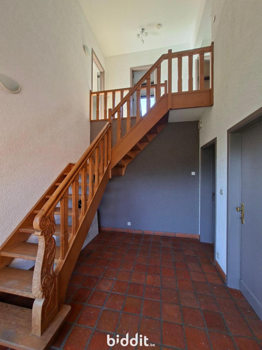 - au rez: d'un spacieux hall d'entrée donnant sur l'étage avec un bel escalier en chêne clair, beau séjour en "L", cuisine semi-équipée (taque électrique-hotte-four-frigo), WC avec lavabo, garage 1 voiture.