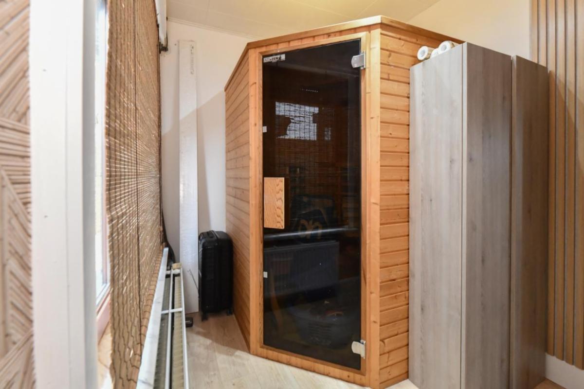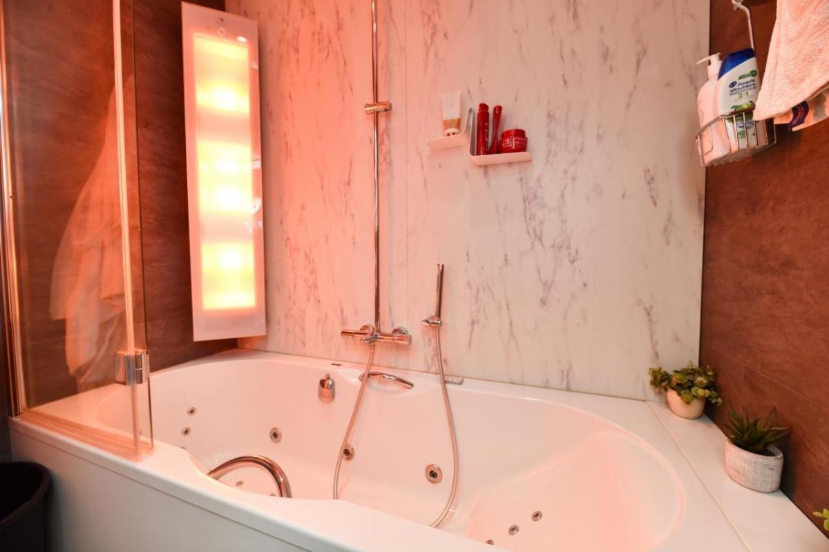 Au rez-de-chaussée : un large hall d’entrée (avec compteurs), une petite chambre (d’enfant), un wc, une chambre parentale, une petite salle de bains (lavabo, baignoire balnéo-douche), un séjour avec feu à pellets, une belle cuisine équipée, un espace bien-être et une petite véranda ;