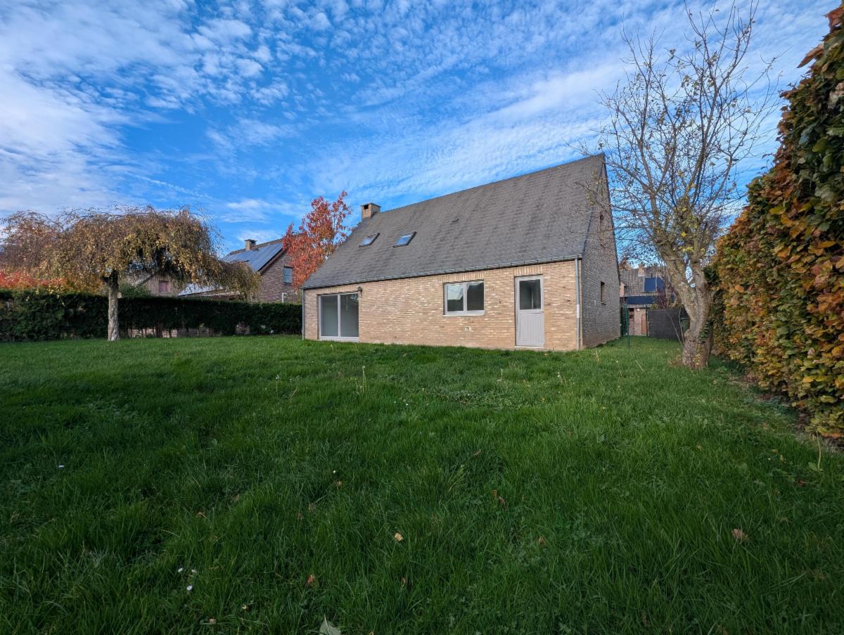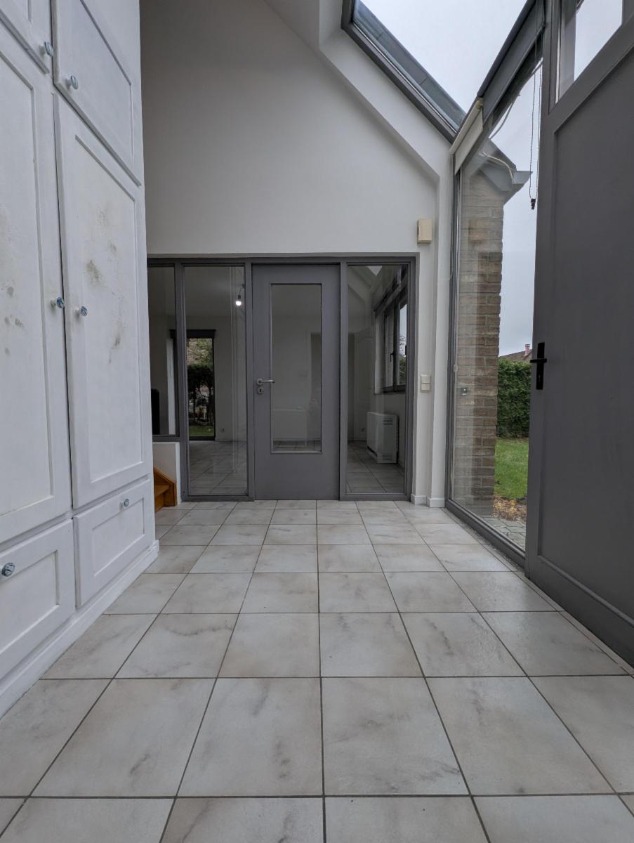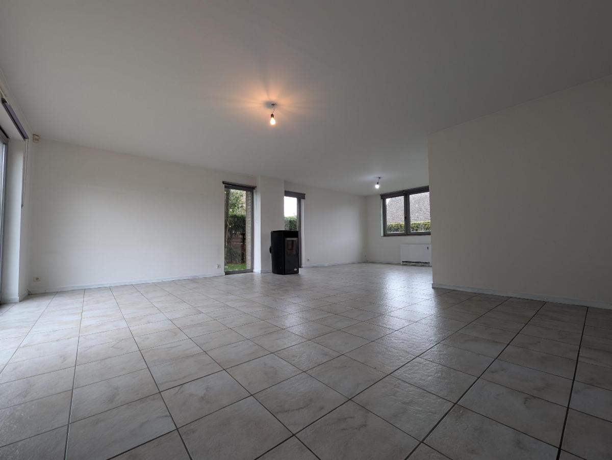 Au rez-de-chaussée : un hall d'entrée avec la cage d'escalier et WC séparé, une pièce de vie spacieuse et lumineuse (avec poêle à pellets) donnant accès au jardin, une cuisine équipée, et une buanderie donnant accès tant au jardin qu'au garage (avec porte sectionnelle manuelle - le vendeur n'est pas en mesure de remettre une clé du garage). Le garage donne également accès au hall d'entrée.