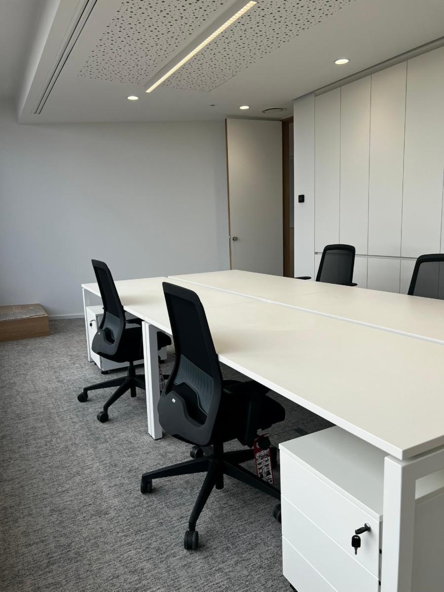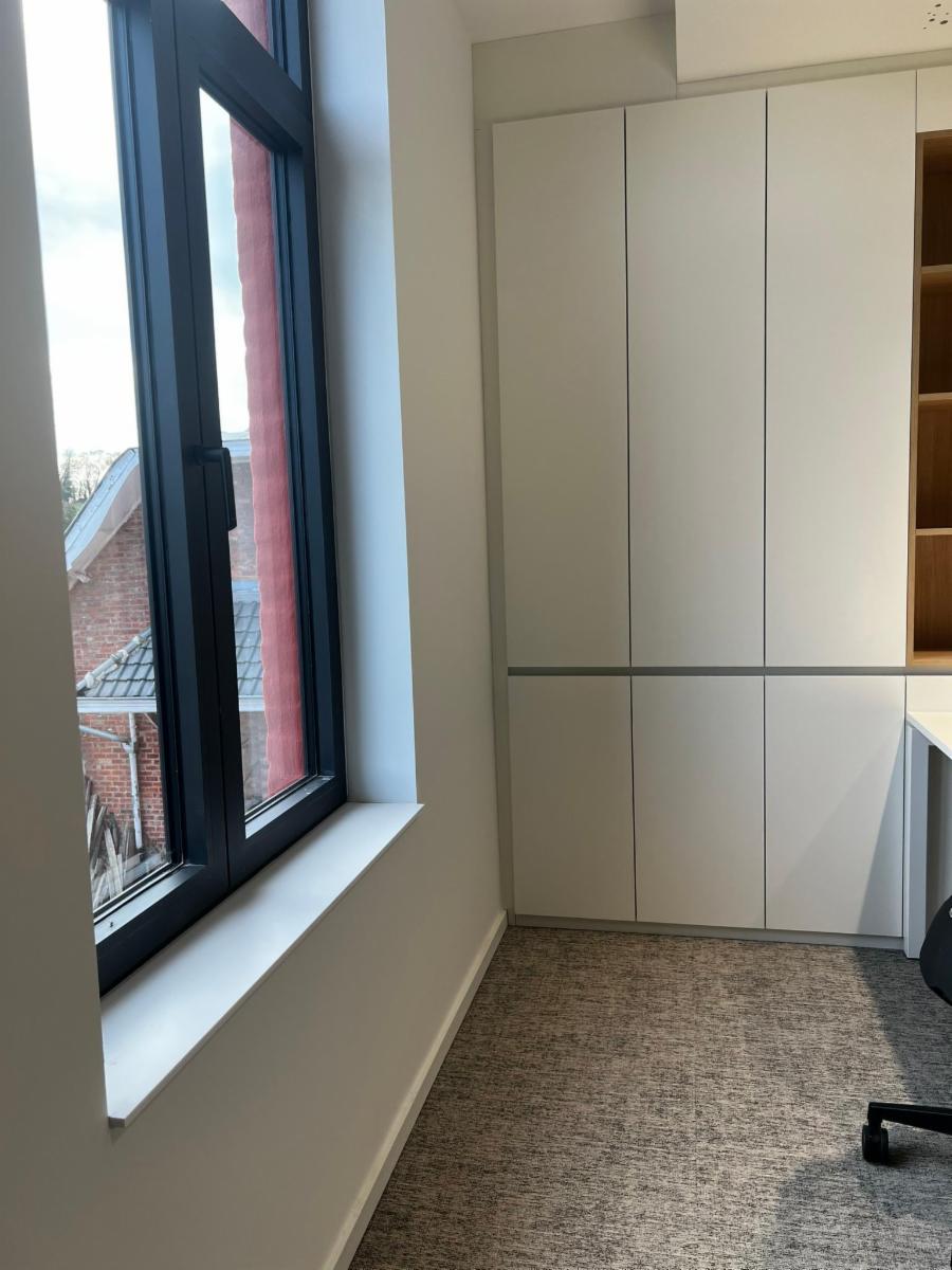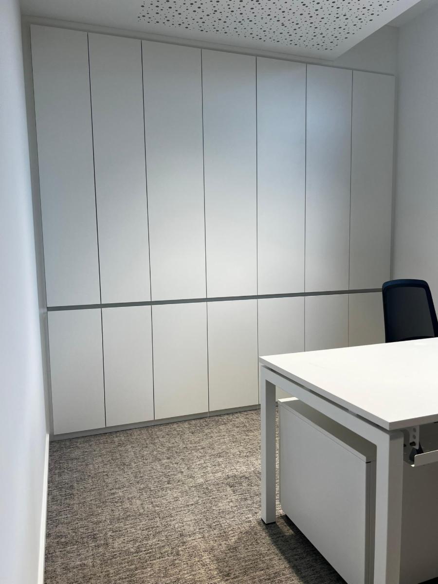 Chaque bureau est équipé de nombreuses armoires réalisées sur mesure et de mobilier contemporain de qualité.