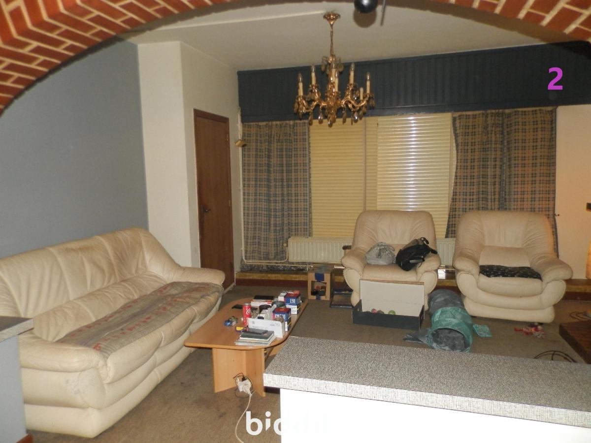 2: Appartement situé au rez-de-chaussée composé de: hall, cuisine, salle de bains, séjour, ddébarras et de 2 chambres. Chauffage central au mazout. Loué (sans bail écrit, sans caution et sans état des lieux) à 450 €.