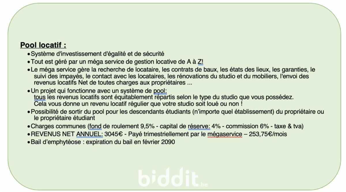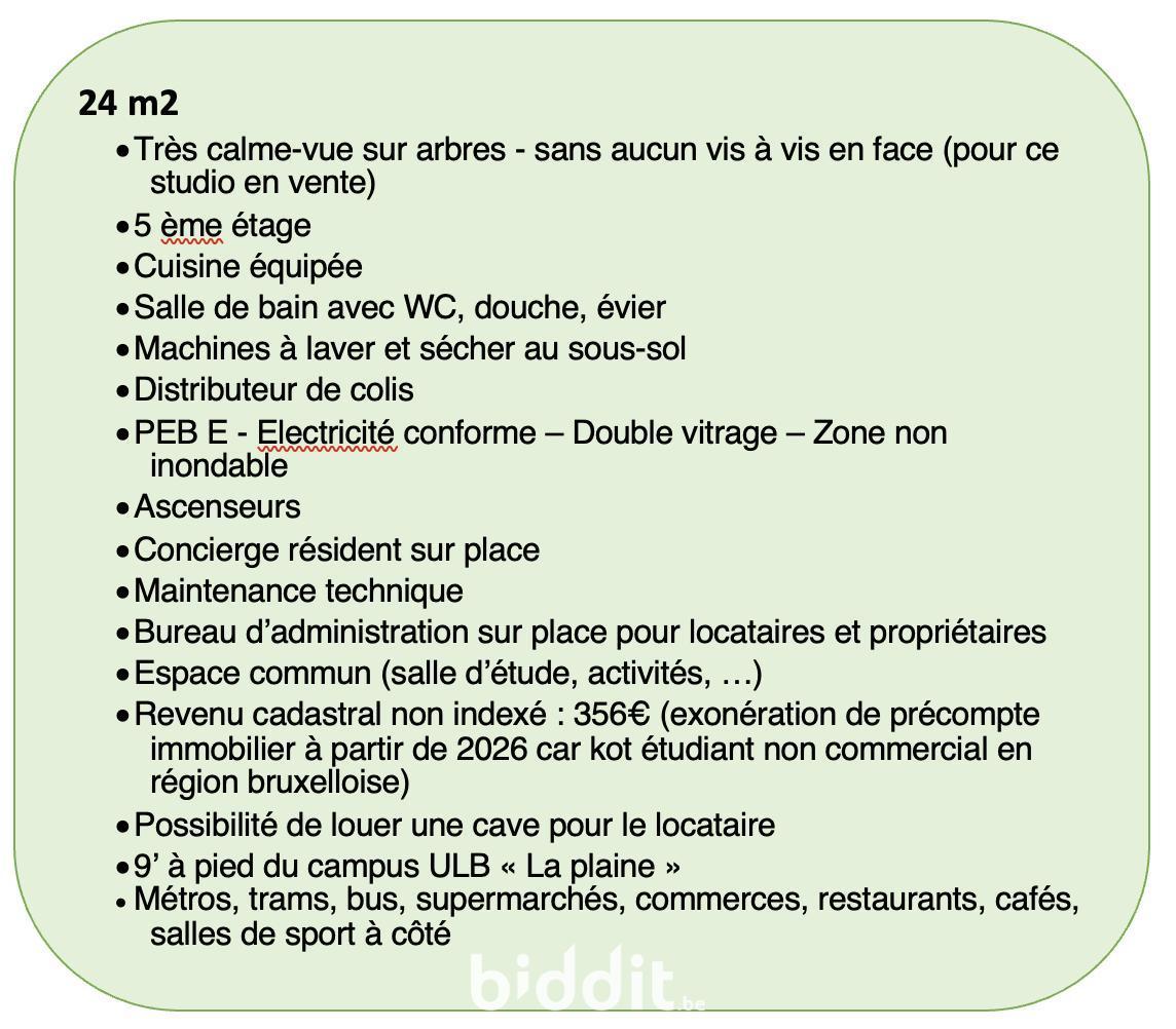 Très calme, vue sur arbres, sans aucun vis-à-vis en face. Compr. : cuisine équipée, sdb avec wc, douche, évier, machines à laver et sécher au sous-sol. Ditributeur de colis. Possibilité de louer une cave. Loué (convention de gestion locative, revenus annuels nets : 3.045€). PEB : F/285. R.c.n.i. 356€. Contr. électr. conforme. Dble vitrage. Visites : Samedis 4/4, 11/4 et 25/4/26 de 14-16h, samedi 18/4/26 de 10-12h, vendredis 10/10, 17/4 et 24/4/26 de 10-12h. L’immeuble se situant dans un périmètre sécurisé, réservation obligatoire minimum 24 heures à l’avance, soit directement par téléphone auprès du propriétaire (GSM: 0495 644 365), soit par mail à l’adresse : irenastudio@icloud.com.