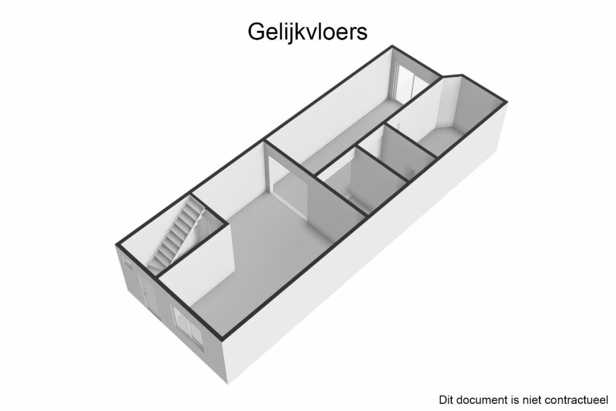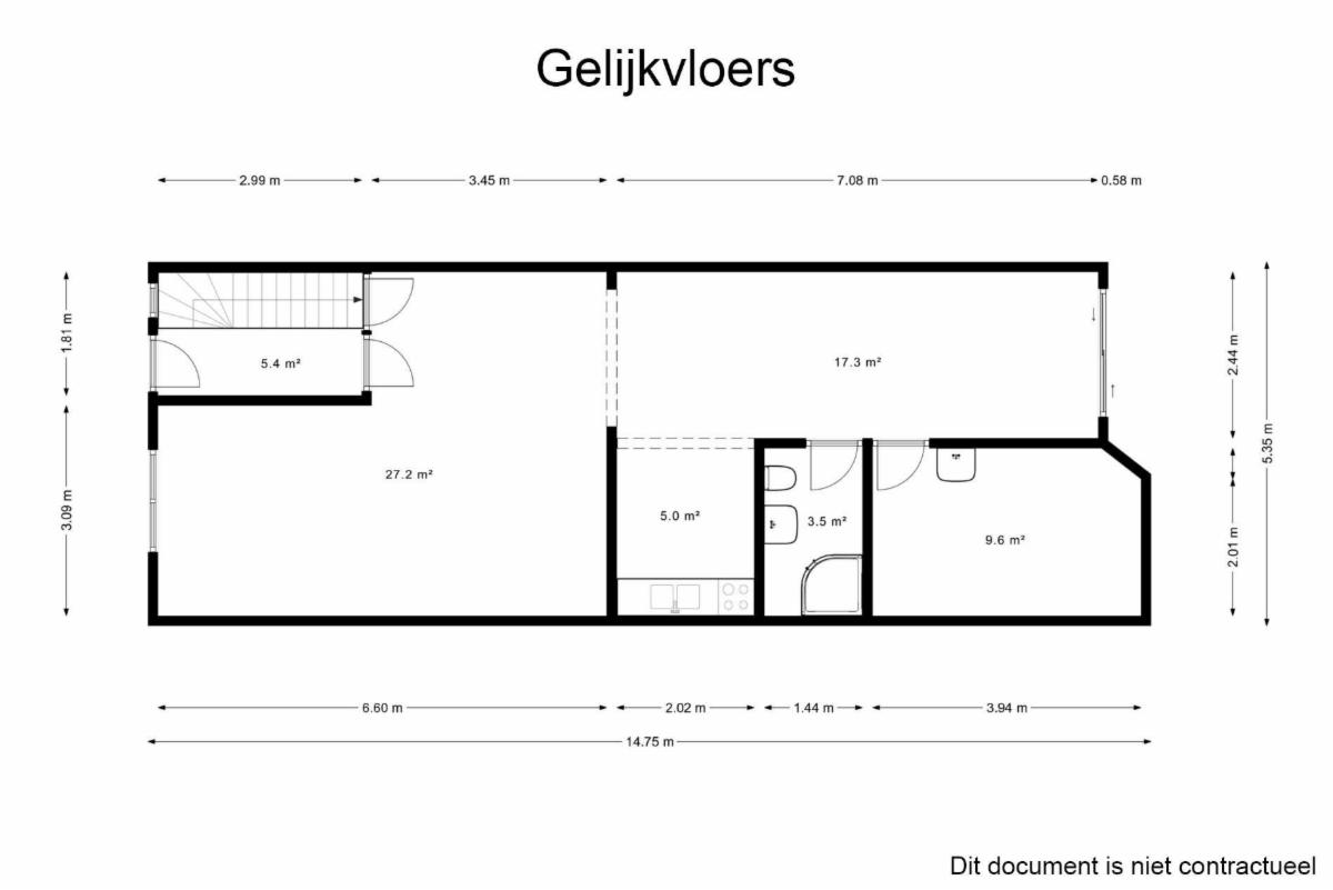 Rez-de-chaussée : hall d’entrée avec escalier, salon, salle à manger, cuisine, salle de bain et jardin.