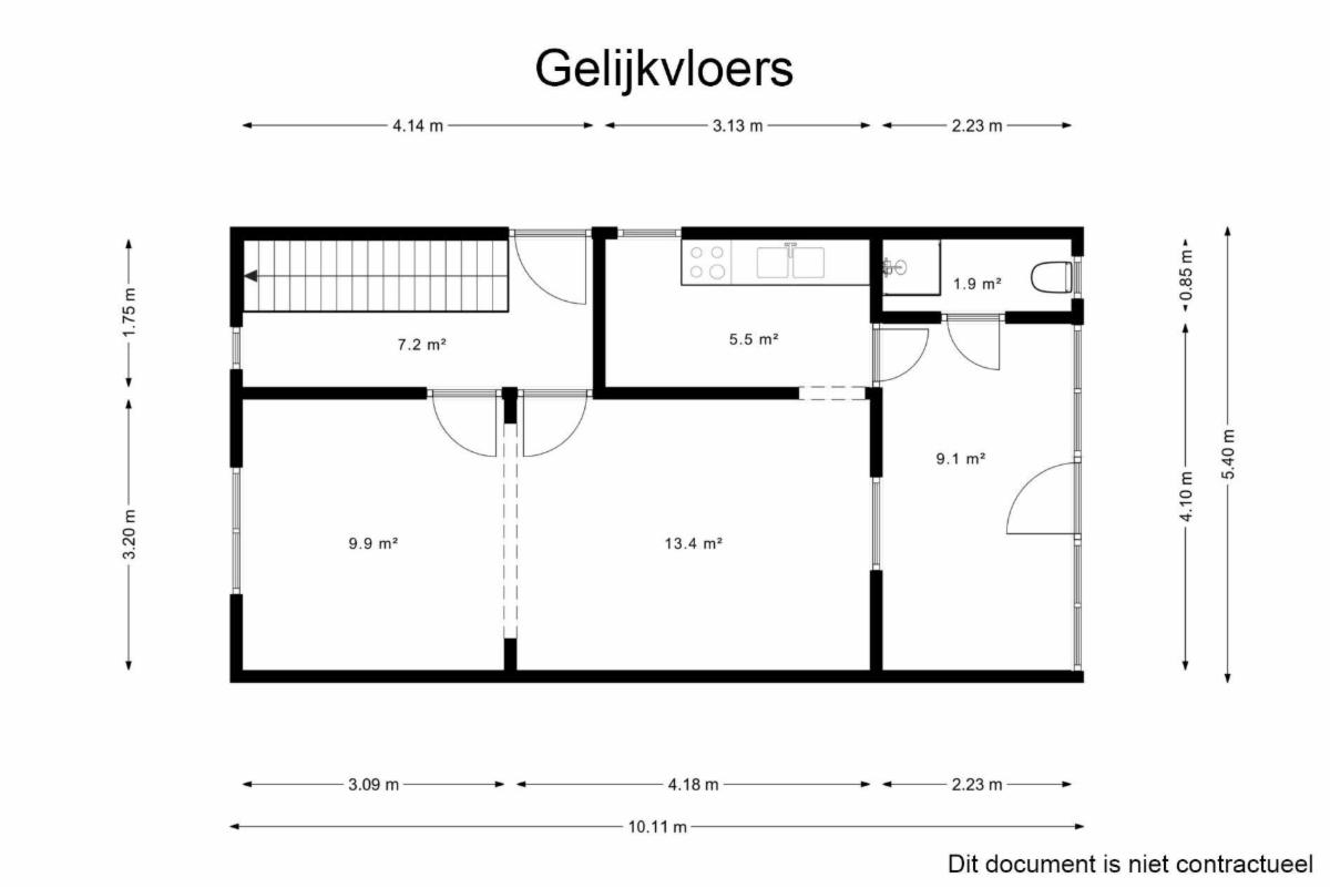 Rez-de-chaussée : hall d'entrée avec escalier, salon/salle à manger, cuisine, salle de bains, véranda et jardin.