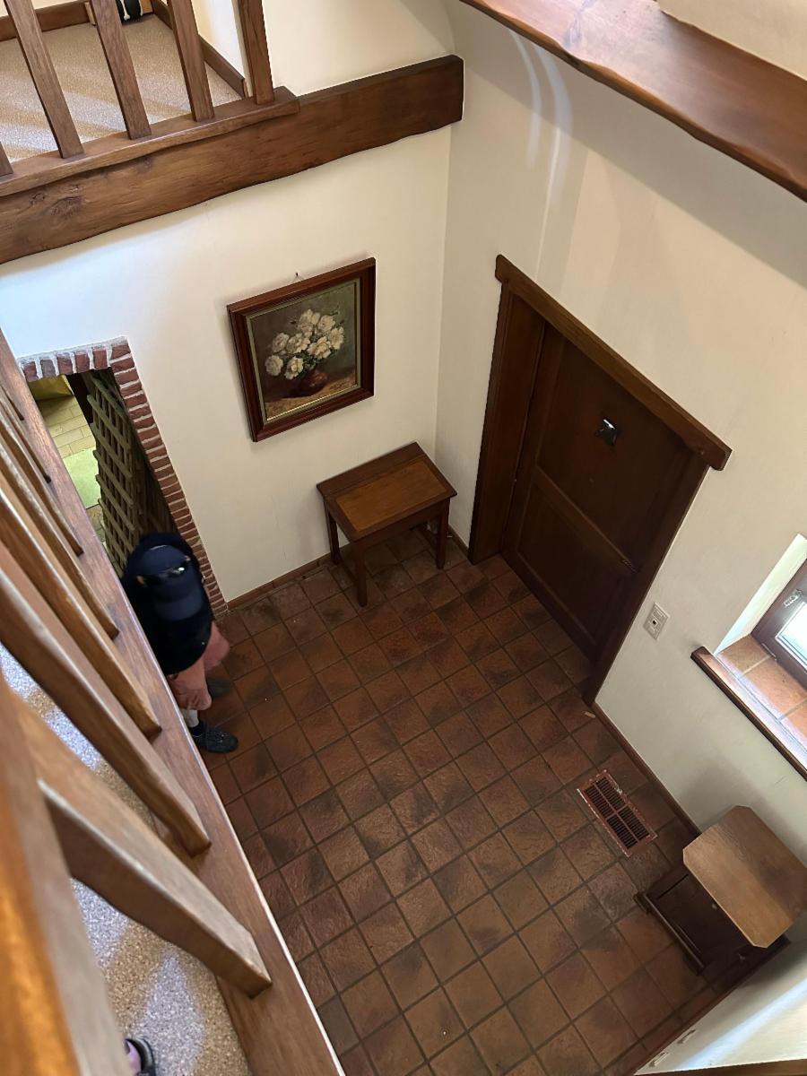Au rez-de-chaussée : un hall d’entrée avec mezzanine et wc avec lave-mains, un séjour (salon/salle-à-manger) avec feu ouvert, une salle de bains carrelée (avec baignoire, lavabo et wc), 1 chambre, une cuisine équipée en chêne avec accès vers l’extérieur, un garage/buanderie carrelé (2 places avec porte manuelle), avec arrière cuisine ;