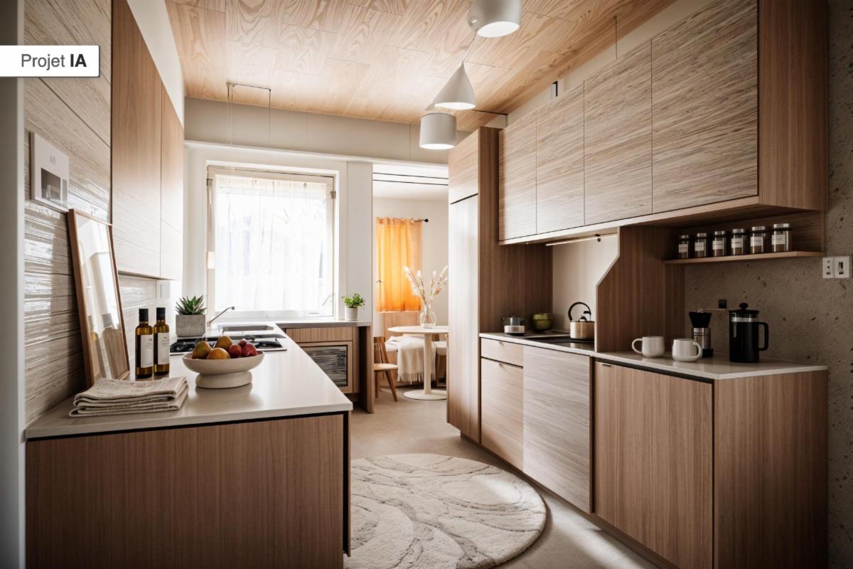 - Un rez-de-chaussée comprenant : un séjour (salon et salle à manger) avec poêle au gaz, une petite cuisine non équipée avec petit espace de stockage, une salle de douche (douche, WC et lavabo) ;