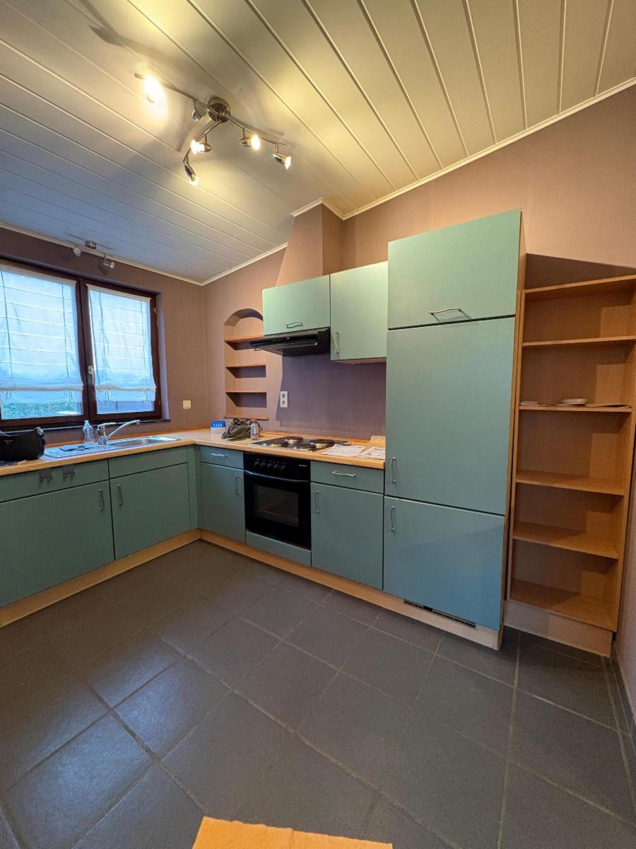 Le rez-de-chaussée se compose d’un hall d'entrée, d’un WC séparé, d’une cuisine ouverte équipée (évier, hotte, frigo, four, taques électriques, petit chauffe-eau), d’une buanderie (chaudière gaz de ville), et d’un accès direct à l’un des garages.