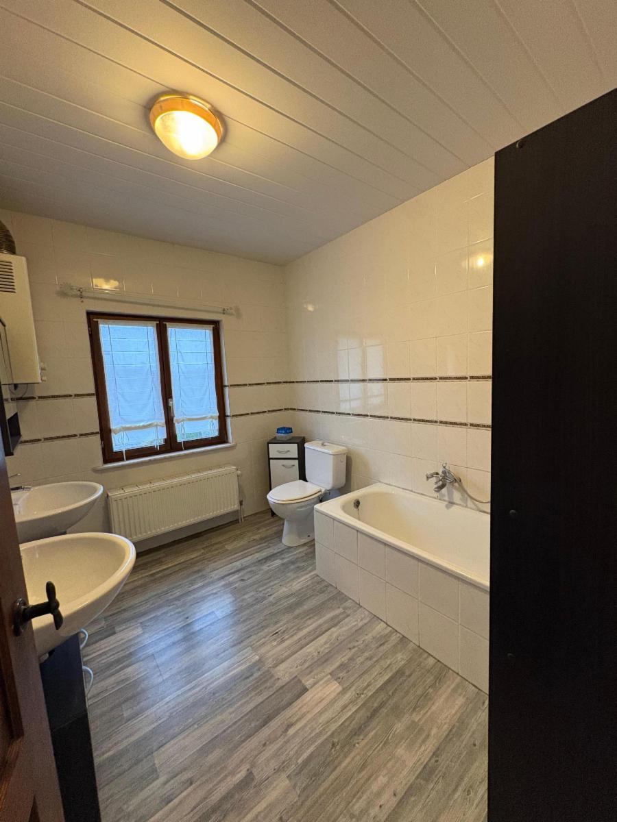 À l’étage, vous trouverez deux chambres et une salle de bain avec baignoire, double lavabo et WC.