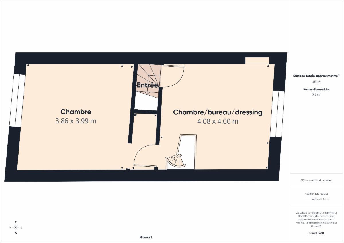 - Premier étage : une chambre, un grand espace pouvant faire office de bureau/dressing ou chambre ;