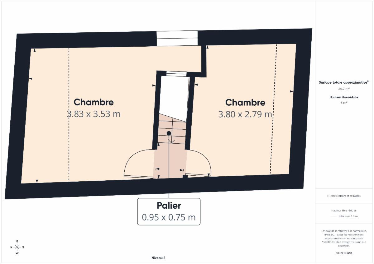 - Deuxième étage : 2 chambres avec rangements sur mesure (sous la mansarde et sous toit ;