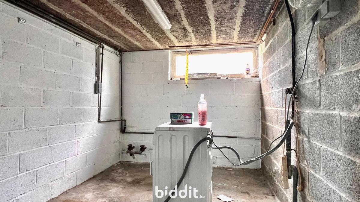 Un hall d’entrée donne accès à un séjour de ± 25 m² disposant d’une cuisine de ± 9 m² attenante. On retrouve également un garage de ± 25 m², une buanderie de ± 9 m² et une chaufferie de ± 5,5 m².