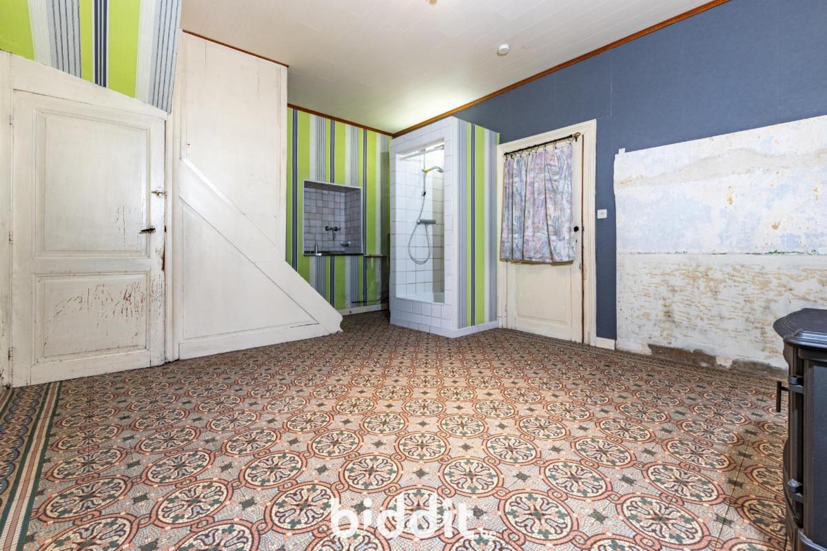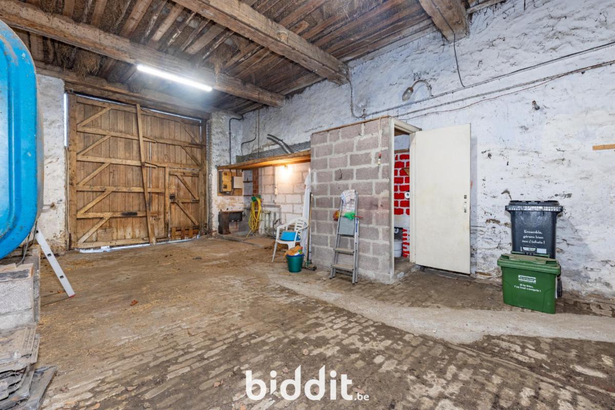 Entrée directe sur cuisine carrelée et poêle à mazout, séjour sur dalles avec poêle à mazout accès cour intérieure, salle d’eau basique carrelée, accès étages et pièce arrière, petit hall carrelé sous l’escalier, ancien atelier sur dalles, garage avec fenil sur le haut, citerne mazout, coin machines avec chauffe-eau, accès à l'étable sur briques.