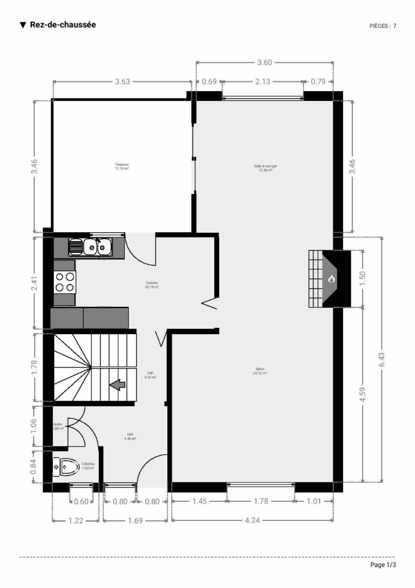 Au rez-de-chaussée : un hall d’entrée, un vaste séjour lumineux avec salon et salle à manger, ouvrant sur une agréable terrasse extérieure. Une cuisine fonctionnelle, ainsi qu'un WC séparé.
