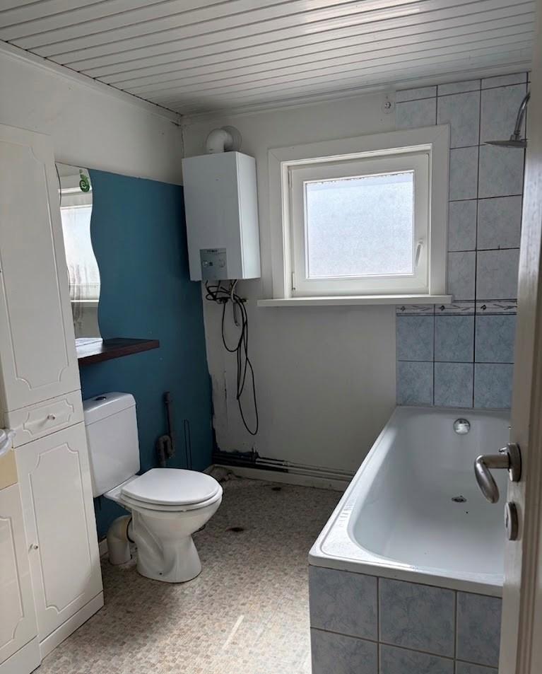 Le rez-de-chaussée se compose d’un hall d’entrée, d’un salon, d’une salle à manger, ainsi que d’une cuisine équipée (taque au gaz, four et frigo). Une salle de bain avec WC, Cave.