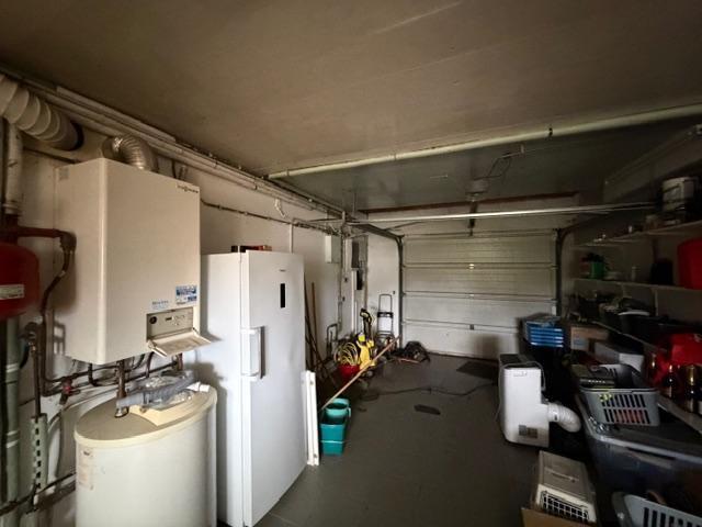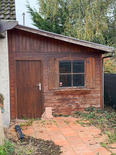 Extérieurs : jardin et chalet de jardin sur le côté, garage avec chaufferie.