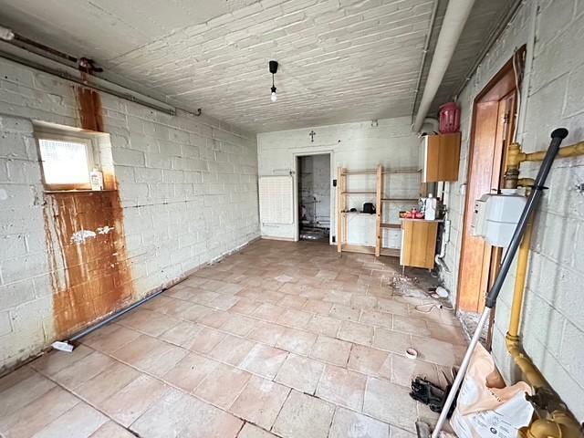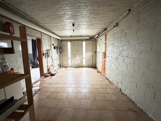 Hall d’entrée carrelé, une salle de bain (évier, WC, baignoire), 1 garage, une cave à l’arrière, un jardin.