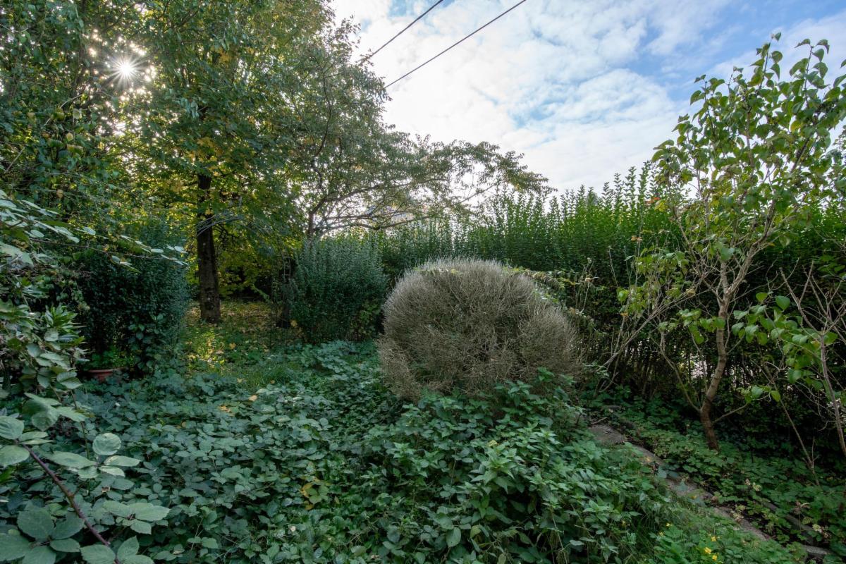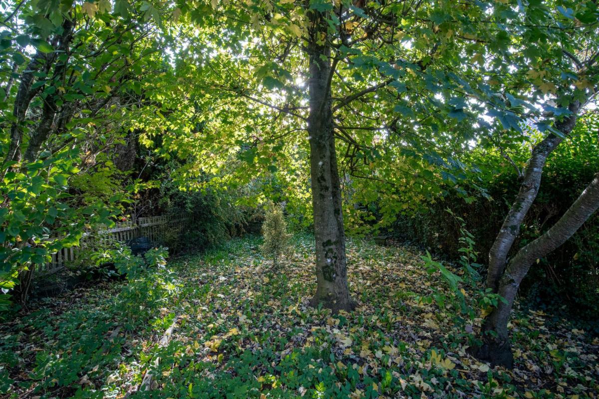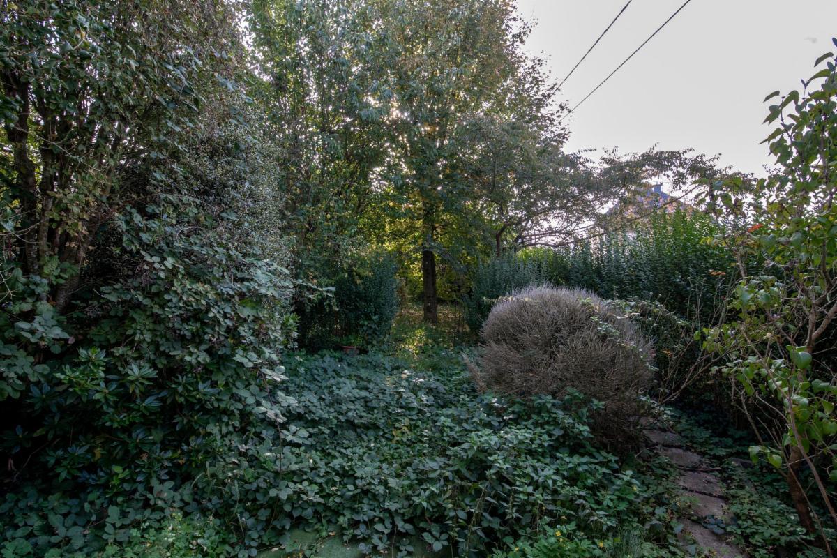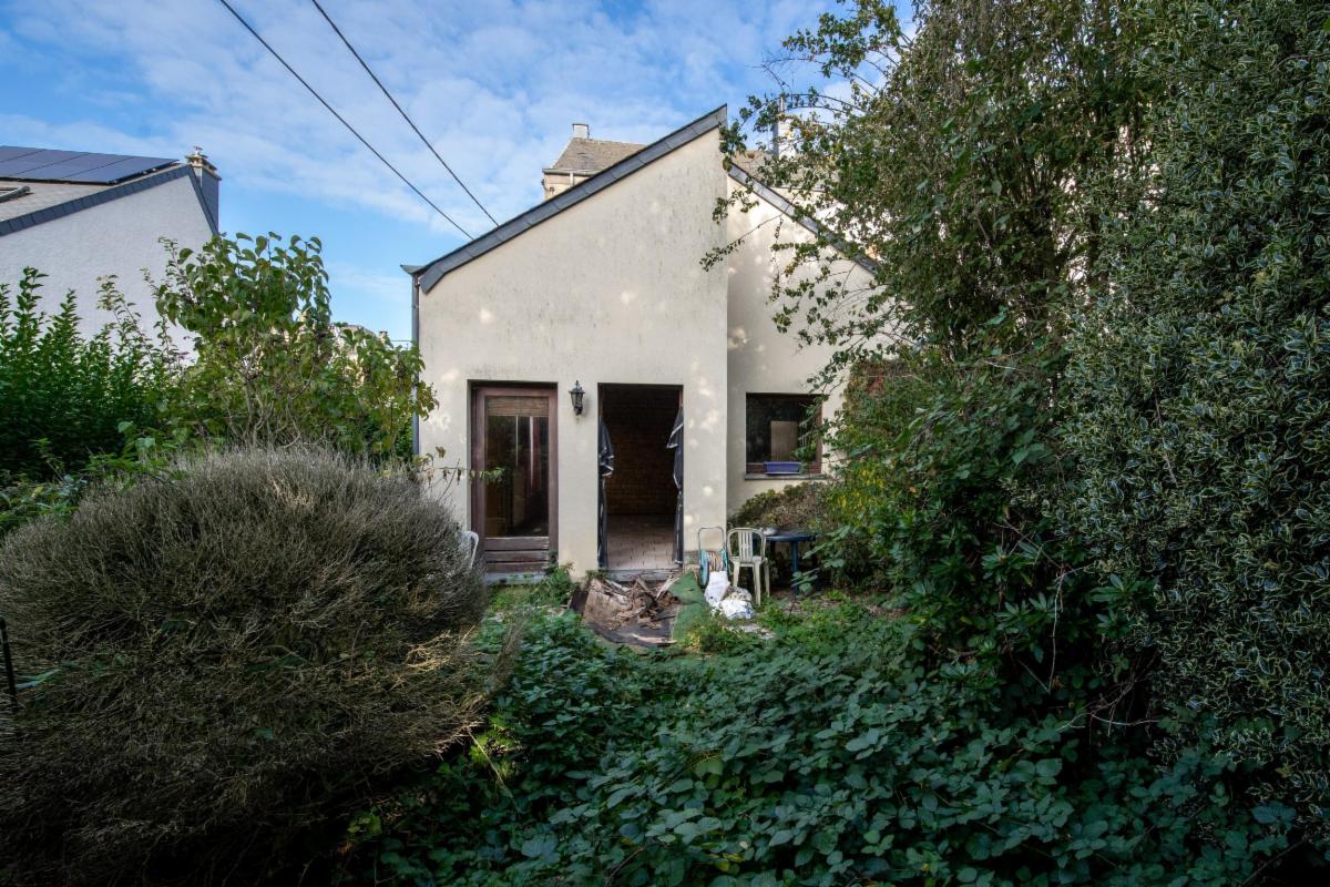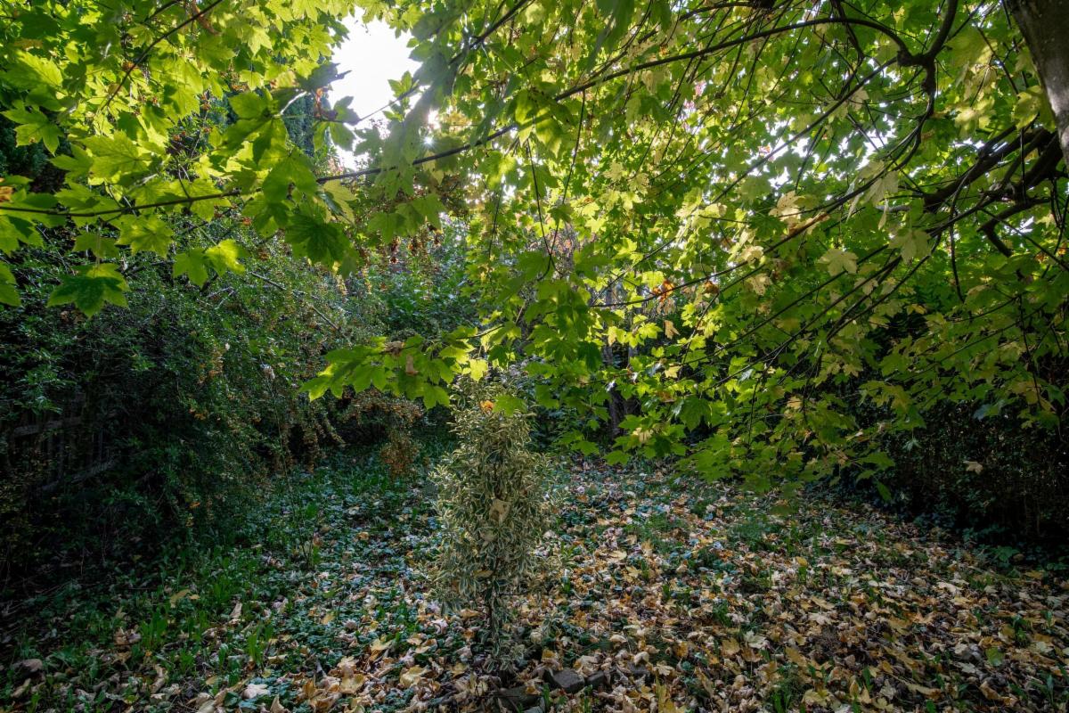 Extérieur : jardin orienté vers la rue de la Clochette, avec un garage en ruine à reconstruire.