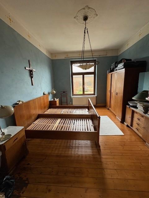 elle maison mitoyenne avec deux étages, comprenant trois chambres, un sous-sol ainsi qu’un jardin.