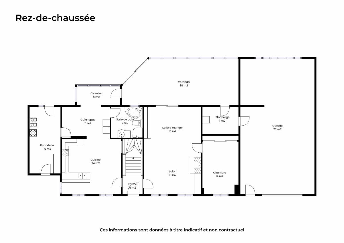- un hall d'entrée, un salon, une salle à manger, une cuisine avec coin repas, une buanderie, une chambre (ou un bureau), une pièce de stockage, une salle de bains/douches avec wc + lavabo, véranda et claustra.