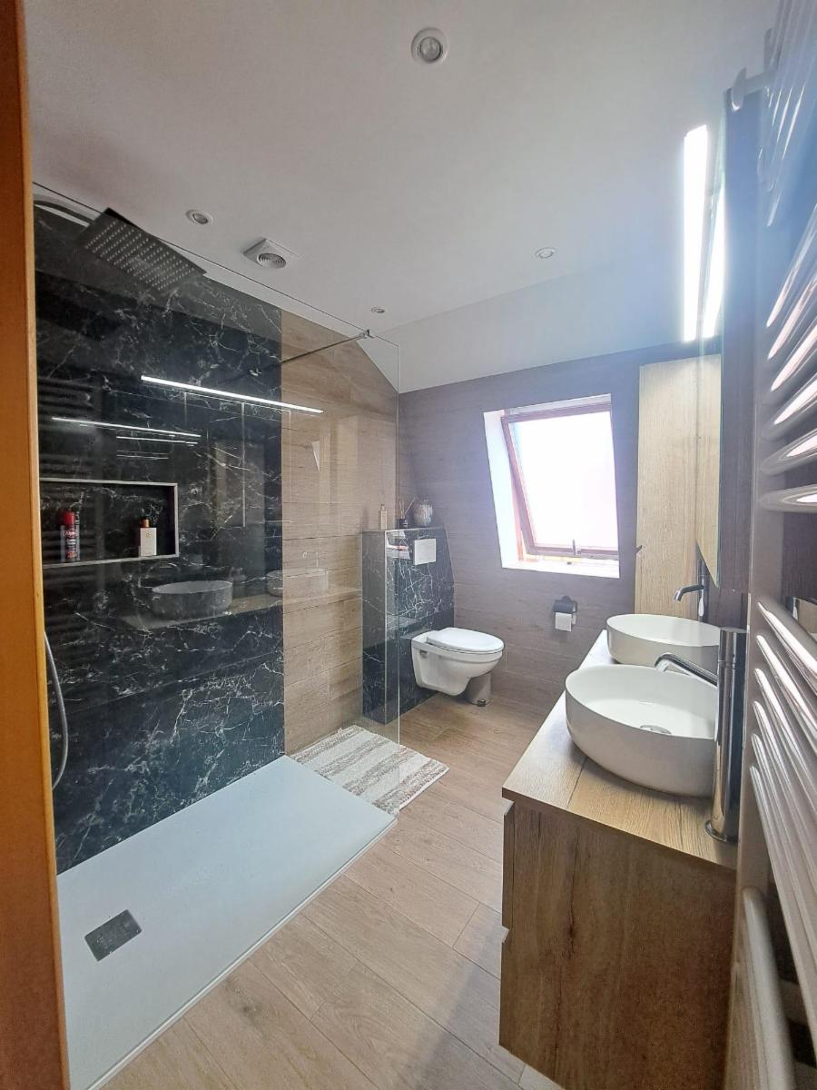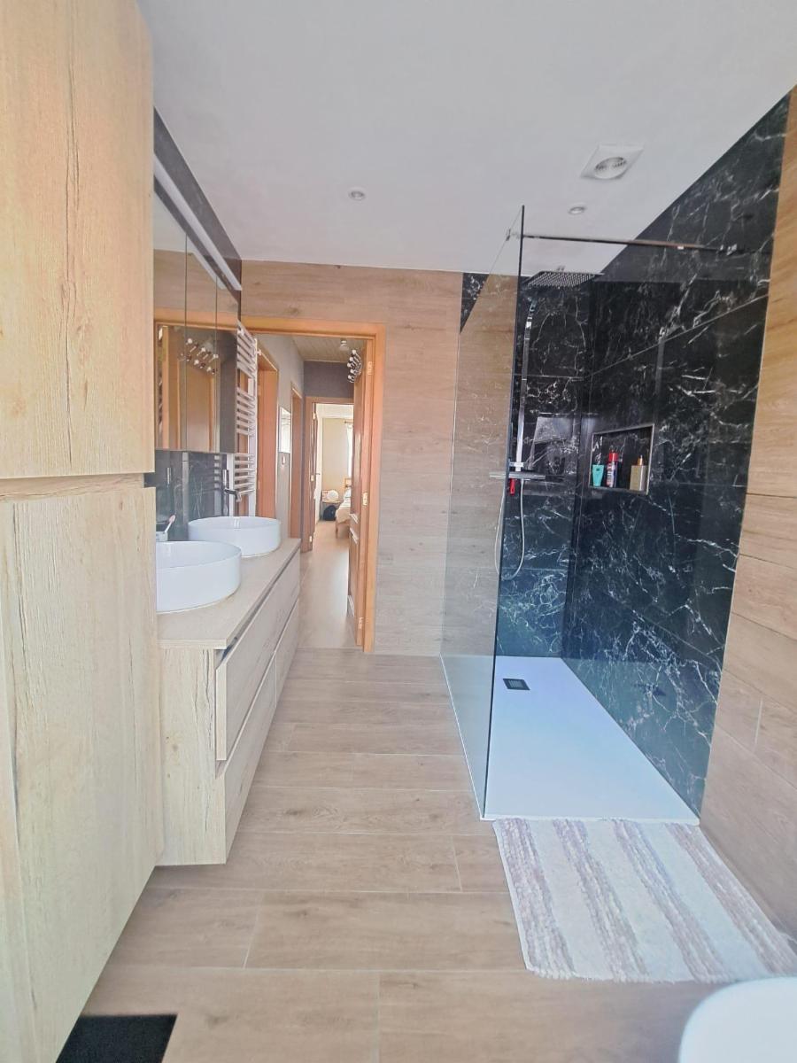 Rez-de-Chaussée: Hall d'entrée, garage 2 voitures avec porte automatique, WC, bureau et terrasse (60m²).