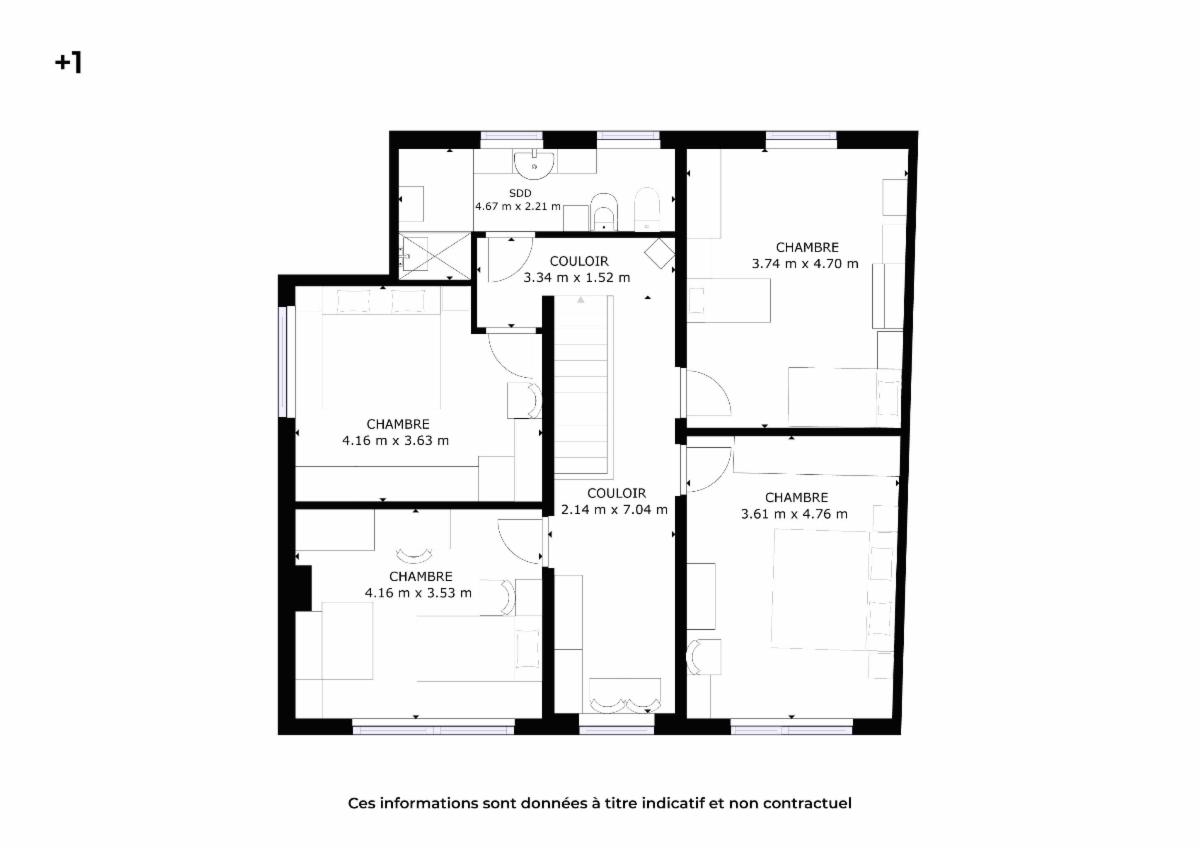au 1er étage: 4 chambres, palier, salle de bains (avec WC, bidet, évier et douche)