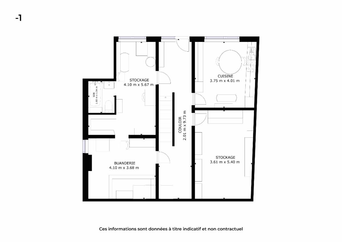 au sous-sol: une buanderie, une salle de bains (baignoire-évier-bidet), deux pièces