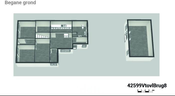RDC : entrée, bureau, salon, cuisine, débarras, salle de bains/buanderie.