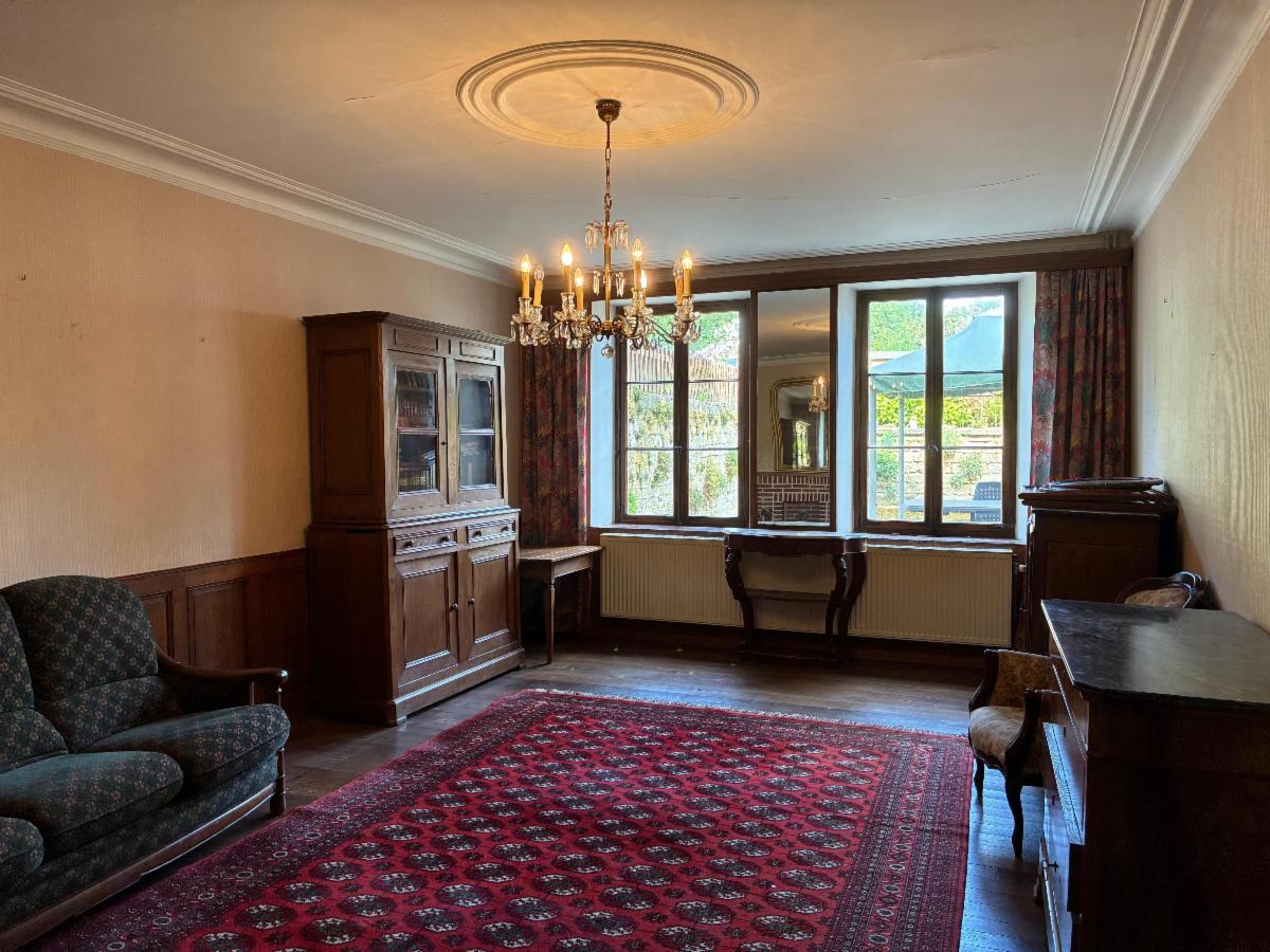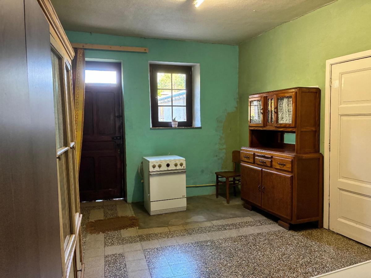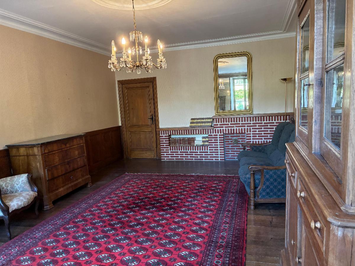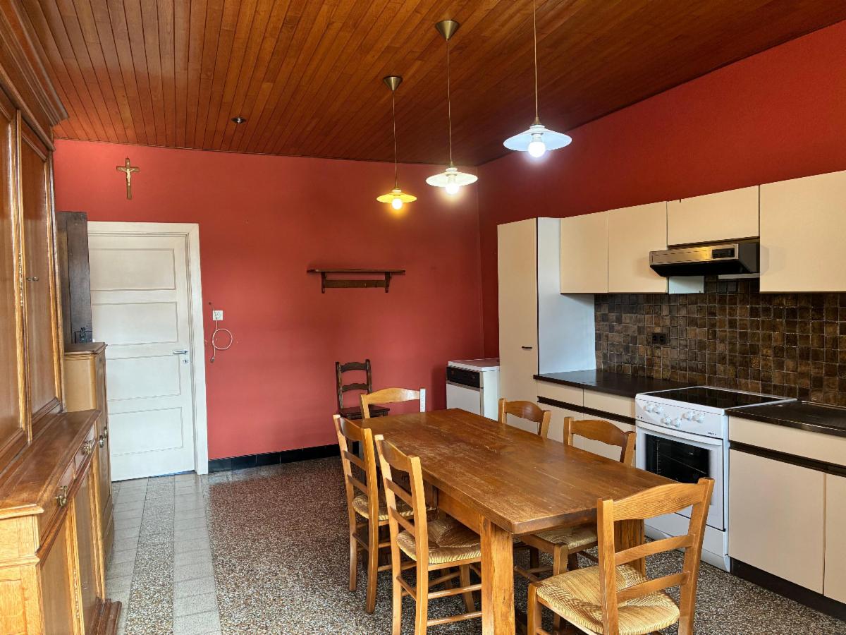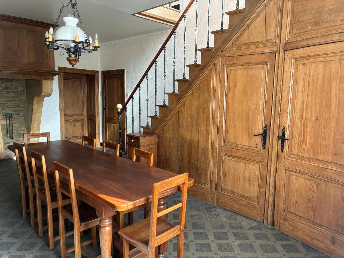 Maison composée au rez-de-chaussée d’une grande cuisine semi-équipée, d’une vaste salle à manger avec grande cheminée, d’un salon lumineux avec parquet et d’une buanderie/salle de bains donnant accès à la terrasse et au jardin.