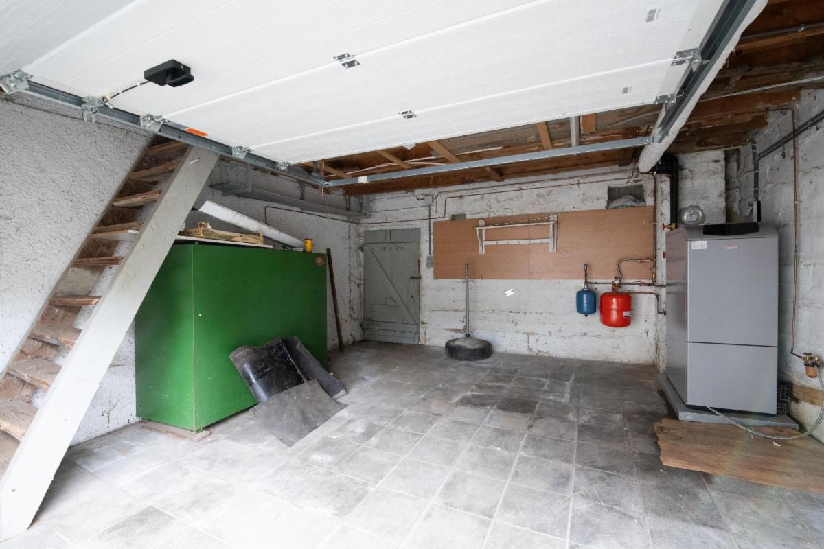Un garage avec chaufferie et accès vers le jardin.
