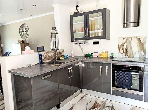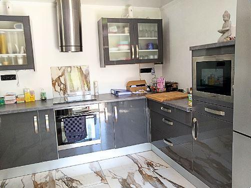 Rez (118m²) : hall d'entrée, living en L avec cuisine équipée, 2 chambres, salle de bains, wc, terrasses