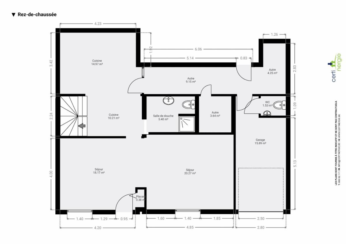 Rez-de-chaussée : séjour, cuisine, salle d’eau, wc, garage, chaufferie.