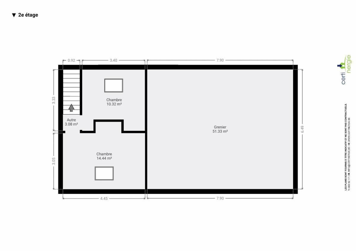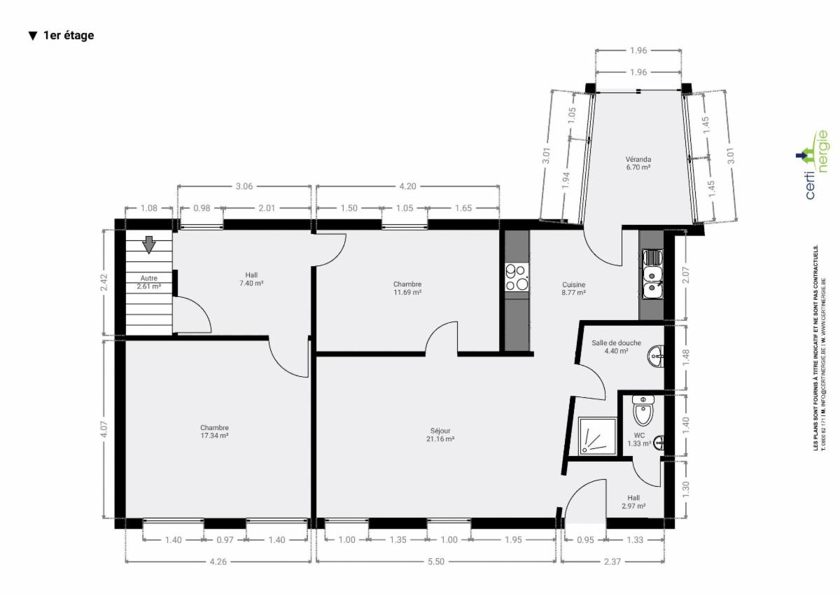 Etage 1 : hall, séjour, cuisine, salle d’eau, deux chambres, véranda.