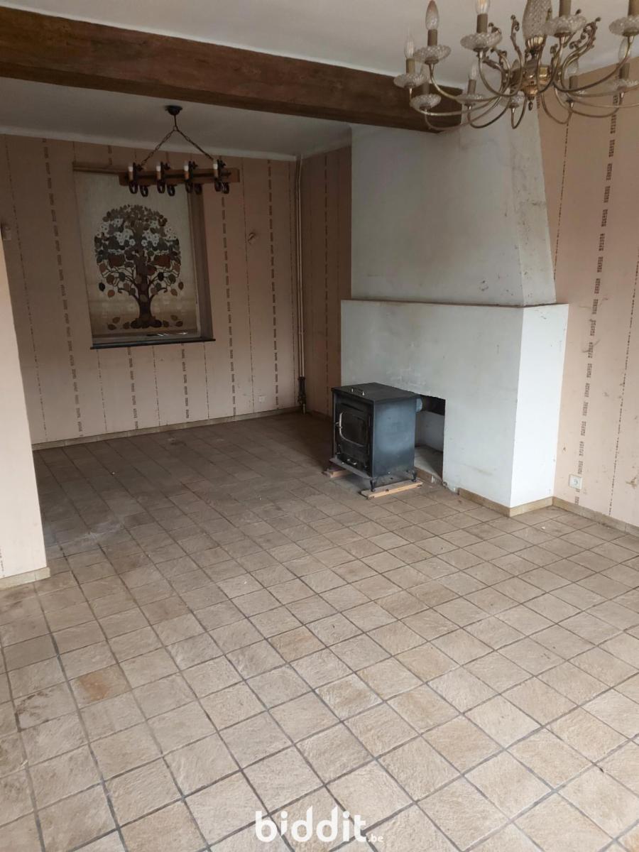 - au rez-de-chaussée : un hall d’entrée, un salon/salle à manger avec poêle à bois, une cuisine non équipée à l’arrière donnant sur le jardin, une arrière cuisine, un garage pour une voiture