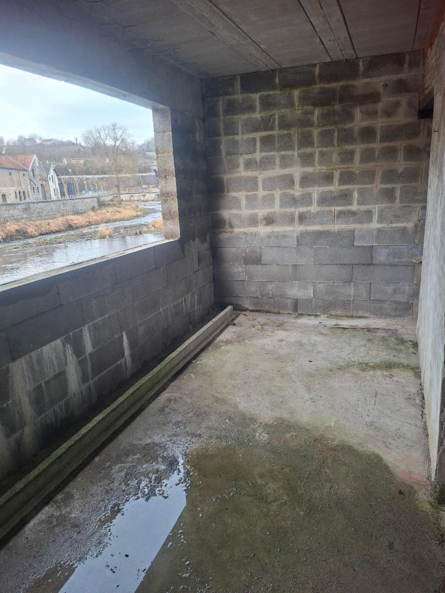 Le bien a été sinistré lors des inondations de 2021. Des travaux ont été entamés par le propriétaire, notamment la réalisation d’un mur anti-inondation, la pose d’une chape en béton armé au rez-de-chaussée ainsi que l’installation d’un clapet anti-retour sur le réseau d’évacuation. À l’arrière, la maison profite d’une vue dégagée sur le cours d’eau. Le mur anti-inondation, réalisé lors des travaux, crée un encadrement architectural qui met le paysage en valeur, à la manière d’un tableau.