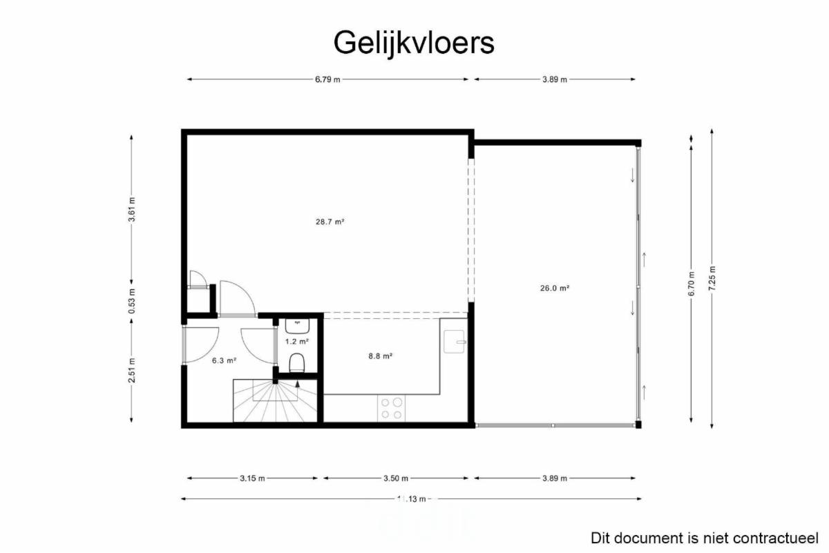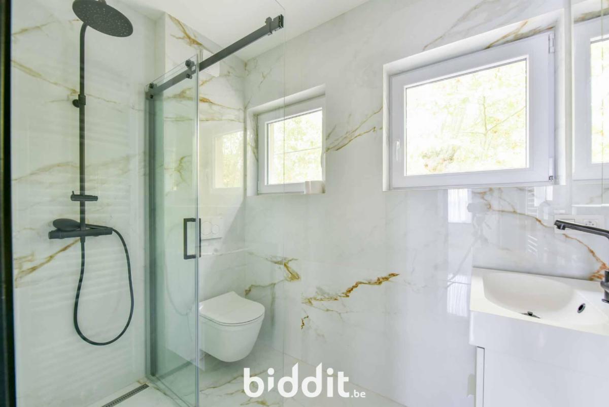 Maison avec hall d'entrée, WC séparé, spacieux salon et cuisine donnant sur une véranda et un jardin avec une bande avant et une bande latérale avec allée. Au premier étage, un salon avec cheminée, une salle de douche et une buanderie ou bureau. Le deuxième étage offre deux chambres, une salle de bain (non aménagée) et une salle de douche supplémentaire. G score: A P score: A
