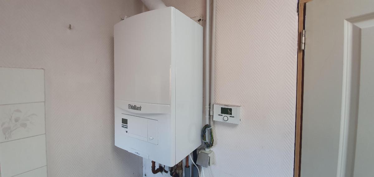 Chaudière murale Vaillant Gaz à condensation et production d'eau chaude, doubles vitrages sur bois.