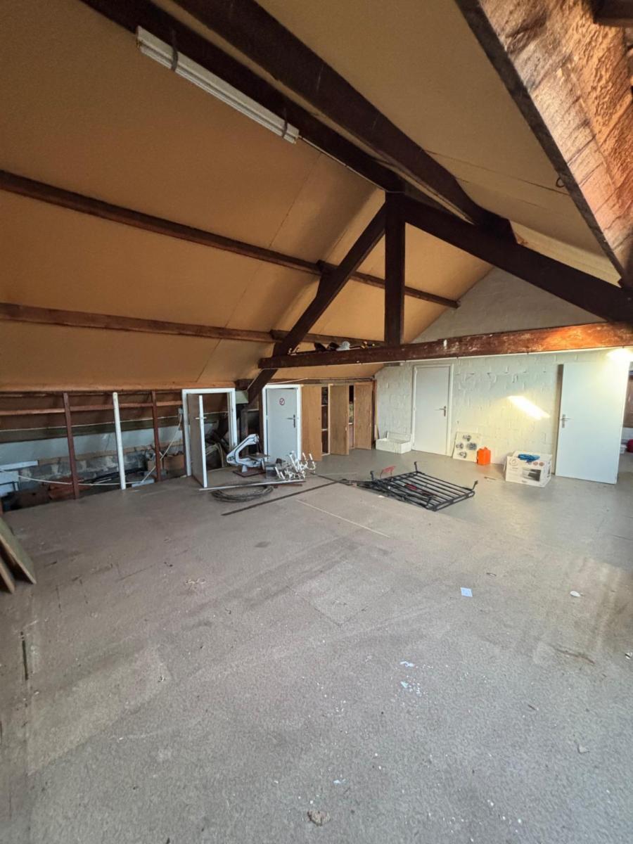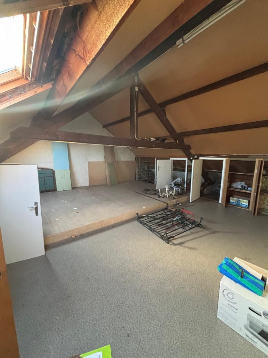 Actuellement, la maison dispose de deux garages, d’un séjour avec salle à manger, d’une cuisine, d’une salle de bains, de deux chambres ainsi que d’un vaste étage sous toiture. Ce dernier est accessible par un escalier fixe et peut être entièrement aménagé selon vos souhaits. Grâce à la surface disponible, il est possible d’y créer jusqu’à trois chambres supplémentaires.