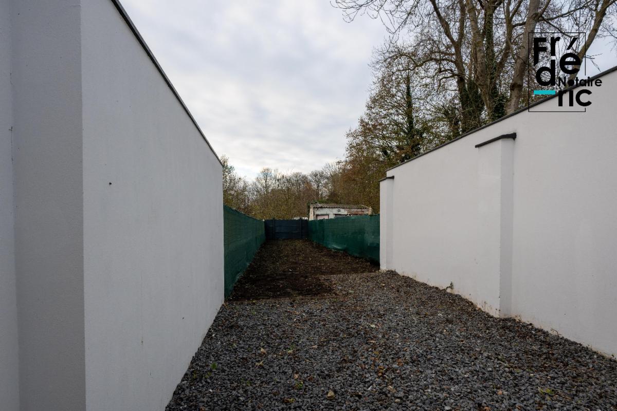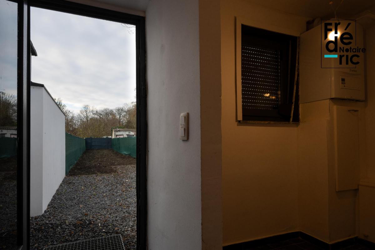 Le rez-de-chaussée se compose d'un grand living, d'une cuisine, d'une salle de bain, et d'une chaufferie. A l'arrière du bâtiment se trouvent une terrasse en gravier et un jardin clôturé.