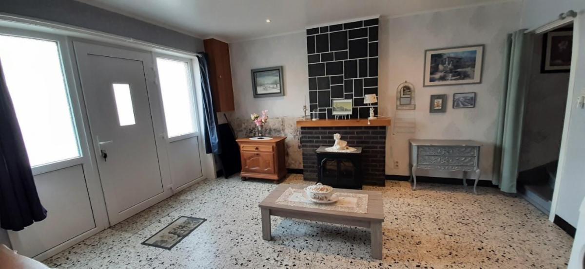 *au RDC: un hall, un salon-salle-à-manger avec cheminée et une cuisine semi-équipée (double évier, plaque vitrocéramique, four électrique, hotte et meubles en bois);