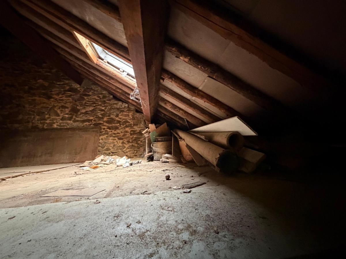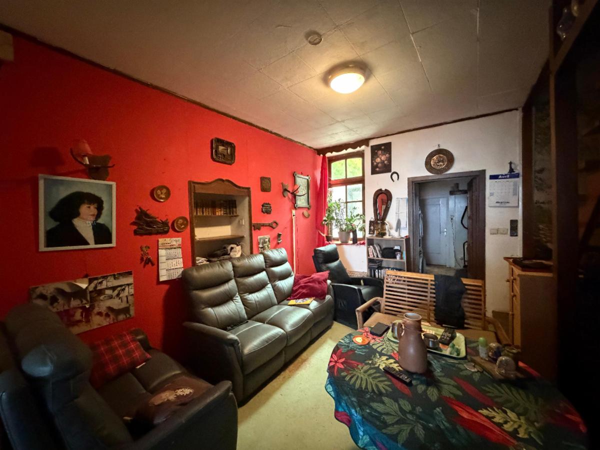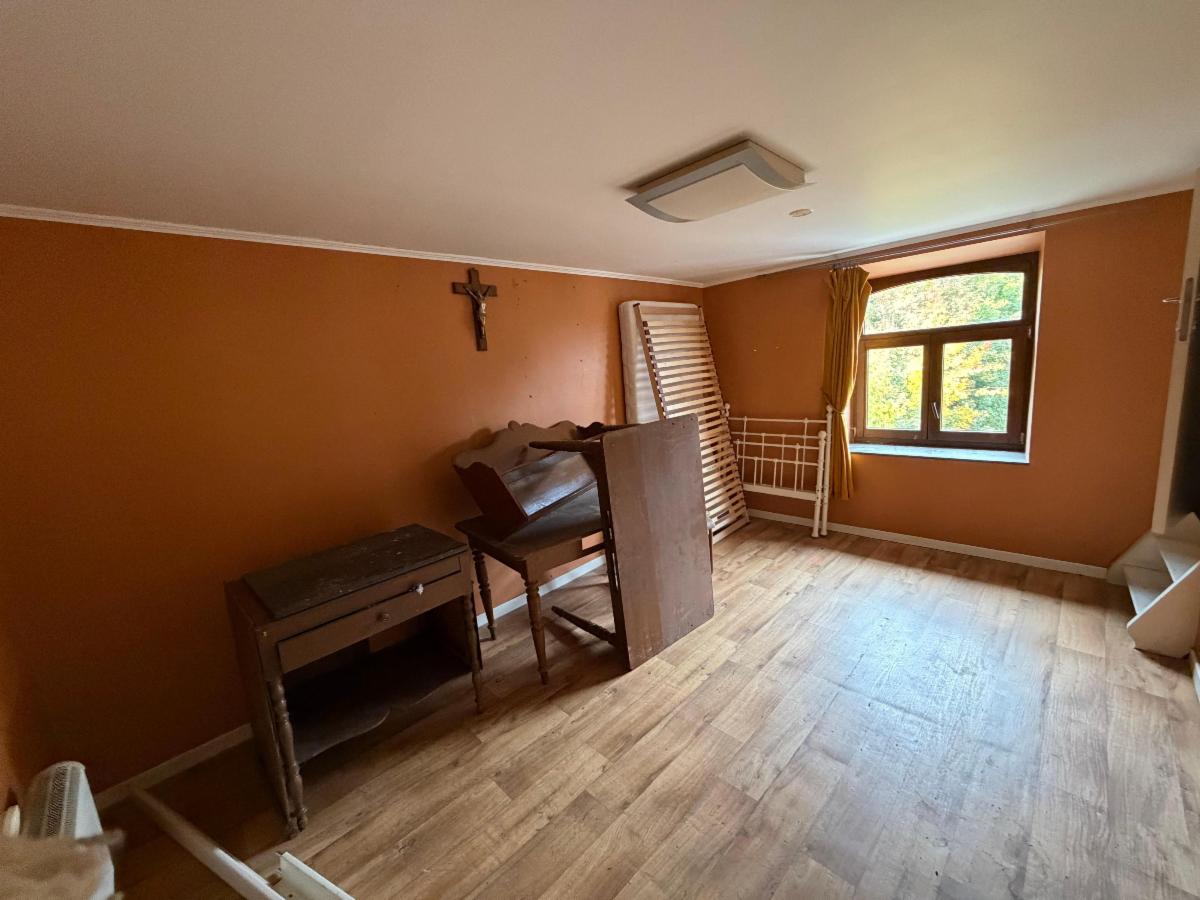 Charmante maison à rénover, composée d’un petit hall d’entrée, d’une cuisine non équipée et salle à manger, de deux grandes chambres et deux plus petites, une salle de bain avec WC à rafraîchir, et d’un grenier aménageable. Le bien dispose d’une cave en dessous des pièces de vie accessible via une trappe située sous l’escalier. Le bien est partiellement équipé de double vitrage (à l’arrière du bâtiment). Poêle à mazout. Un joli jardin se situe à l’arrière, avec passage sur le côté de la maison.