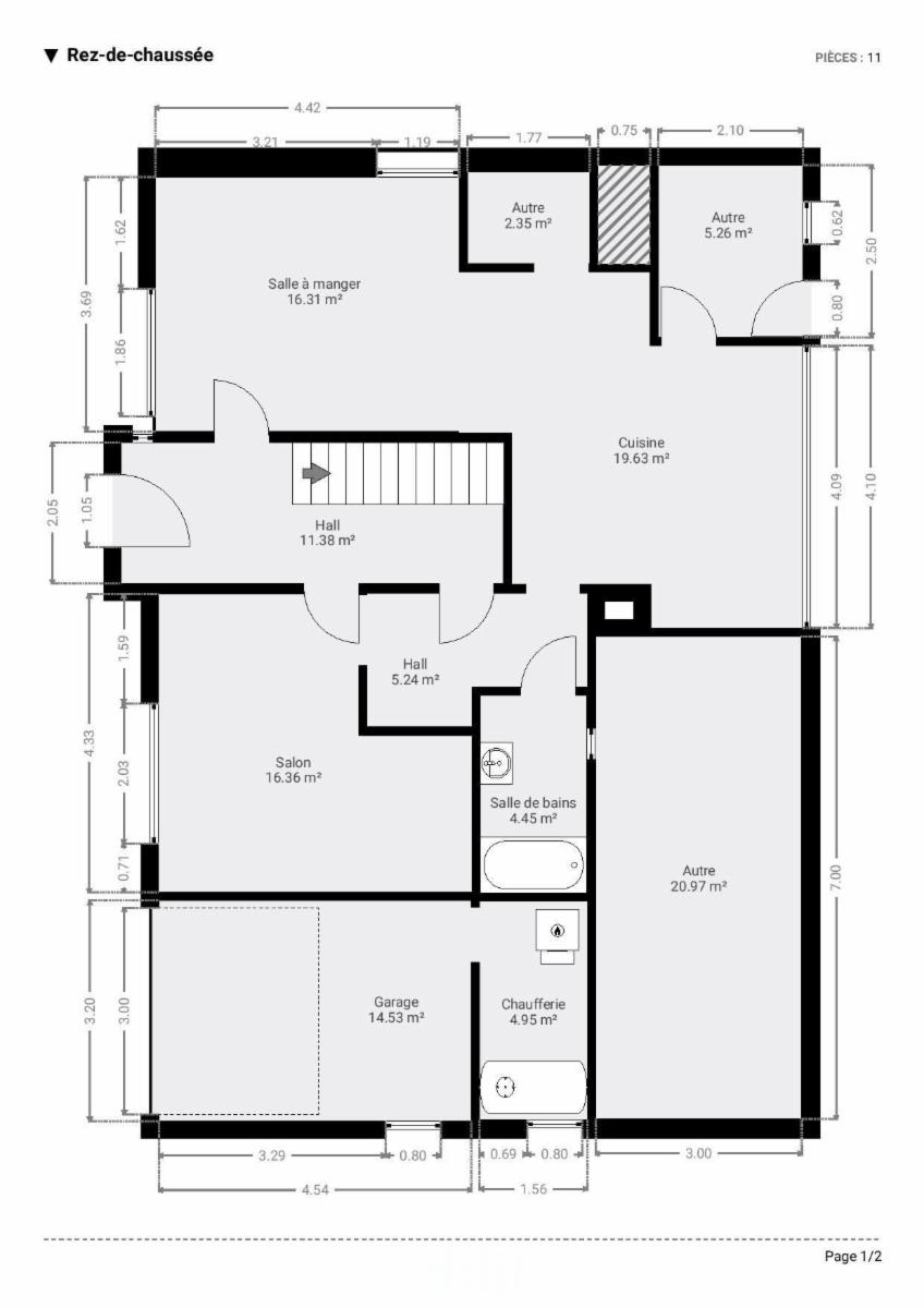 - Au rez-de-chaussée : Un hall, salle à manger, cuisine, salon, salle de bain, garage et chaufferie